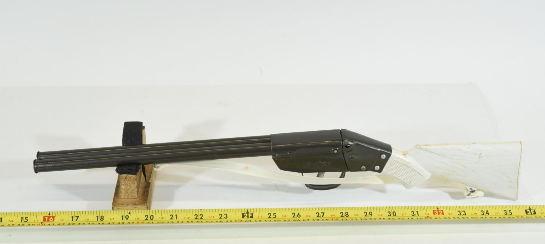 20" long. Plastic butt stock is discoloured but intact. Action cocks and fires.