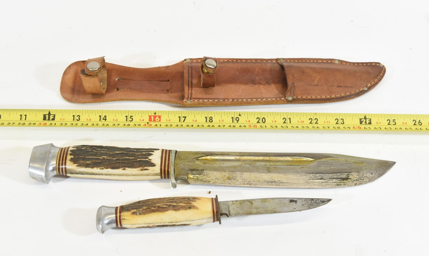 1) Blade is 8" long and overall length is 13". 2) Blade is 4" long and overall length is 8". Both blades are still packed in grease. Made by Imperial Gudedge Solingen.