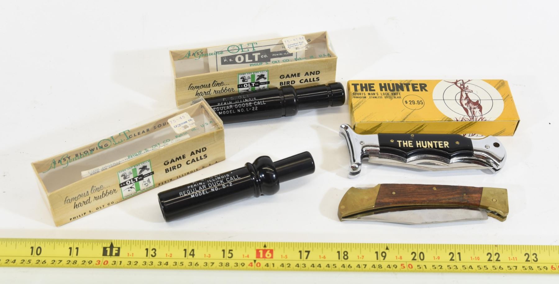 1) OLT regular duck call D-2. 2) OLT regular goose call L-22. 3) Pocket knife. Blade 4". Overall length is 9". 4) The Hunter pocket knife. Blade is 3.5". Overall length is 8".