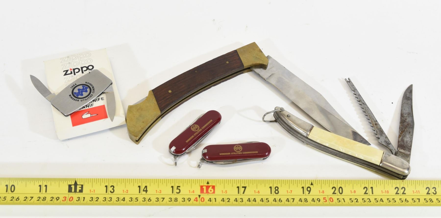 1) 2 Windsor Utility Commission pocket knives. Blades are 1.25". Has nail file, scissors, tooth pick and tweezers. 2) Windsor Utility Commission Zippo pocket knife. Blade is 1.25". 3) Pearl Handle pocket knife. Blade is 3.5" and saw blade is 3". Overall length is 8.75". 4) Woodman large wooden handle pocket knife. Blade is 4.5". Overall length is 11".