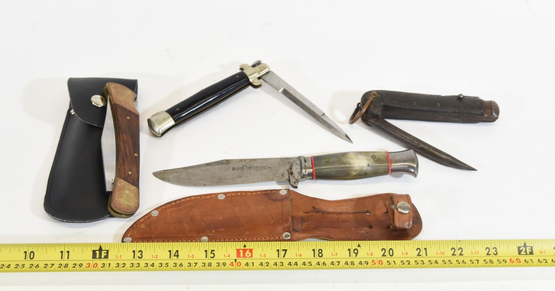 1) Fig Cutlery made in Italy. Blade is 4.25" and overall length is 8.25". 2) Wood handle mariners knife spike with 3.5" blade 3.5". 3) Switchblade manual opening knife. Blade is 3.25" and overall length is 8.75". 4) Woodman large wooden handle pocket knife. Blade is 3.5" and overall length is 8.5".