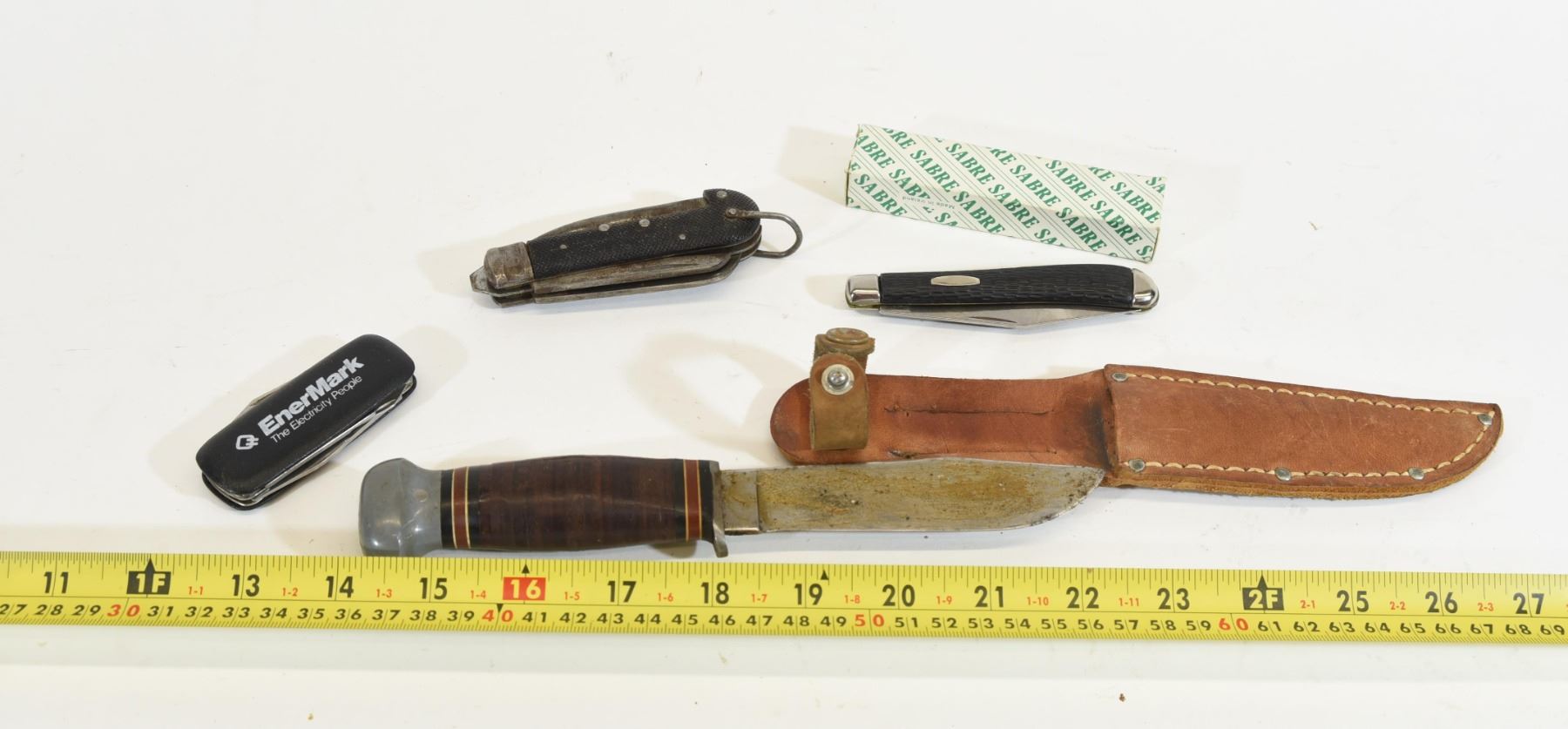 1) Vintage PAL RH-50 knife. Blade is 4" and overall length is 8.5". 2) Belgian Military Surplus Mariners Knife Spike with 2.5" blade. 3) Sabre Pocket knife. Blade is 3" and overall length is 7.25". 4)EnerMark pocket knife. Blade is 1.75". Has nail file and scissors.
