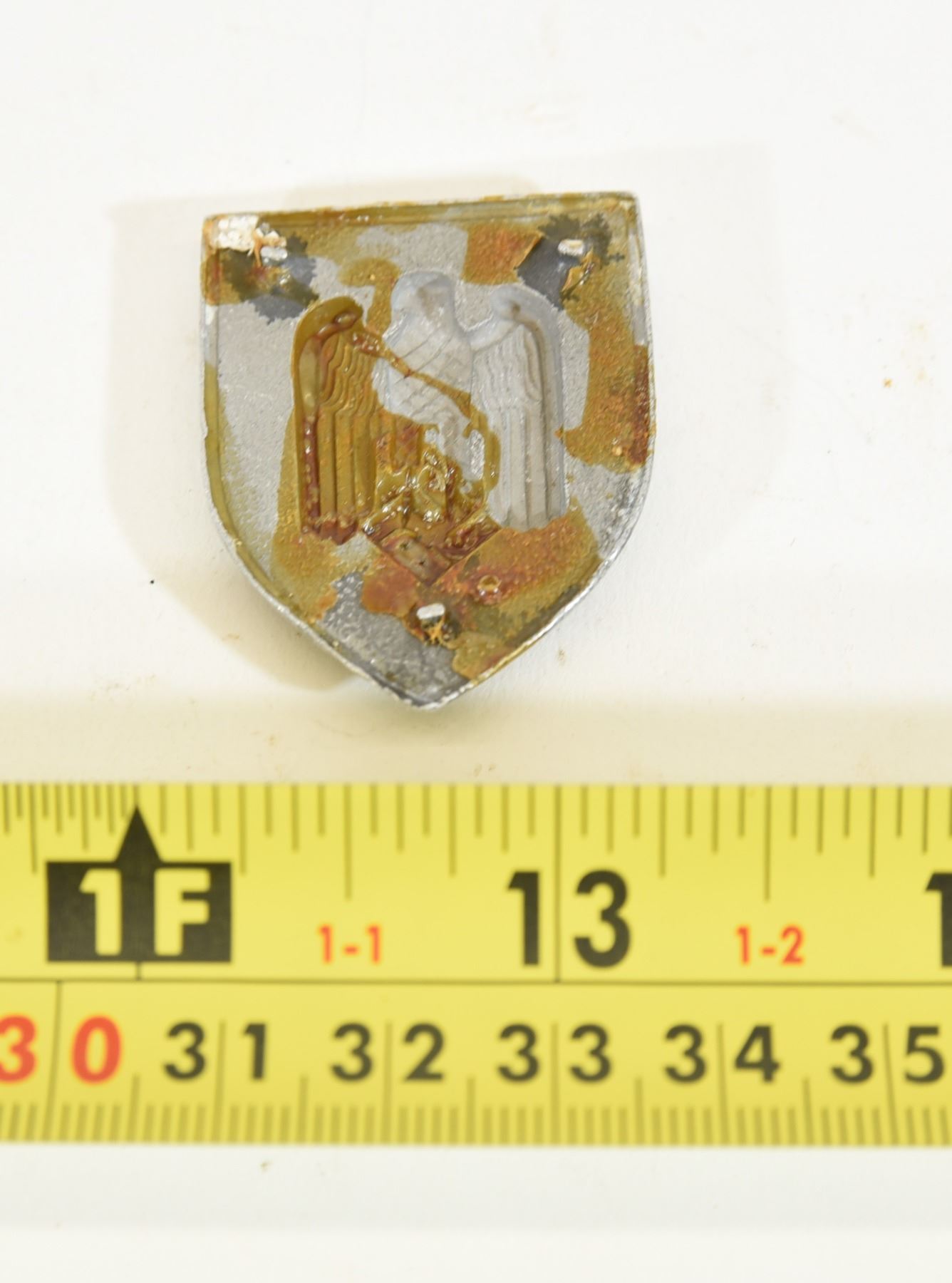 Made from non-ferrous metal. Has residue on back and 3 pegs.
