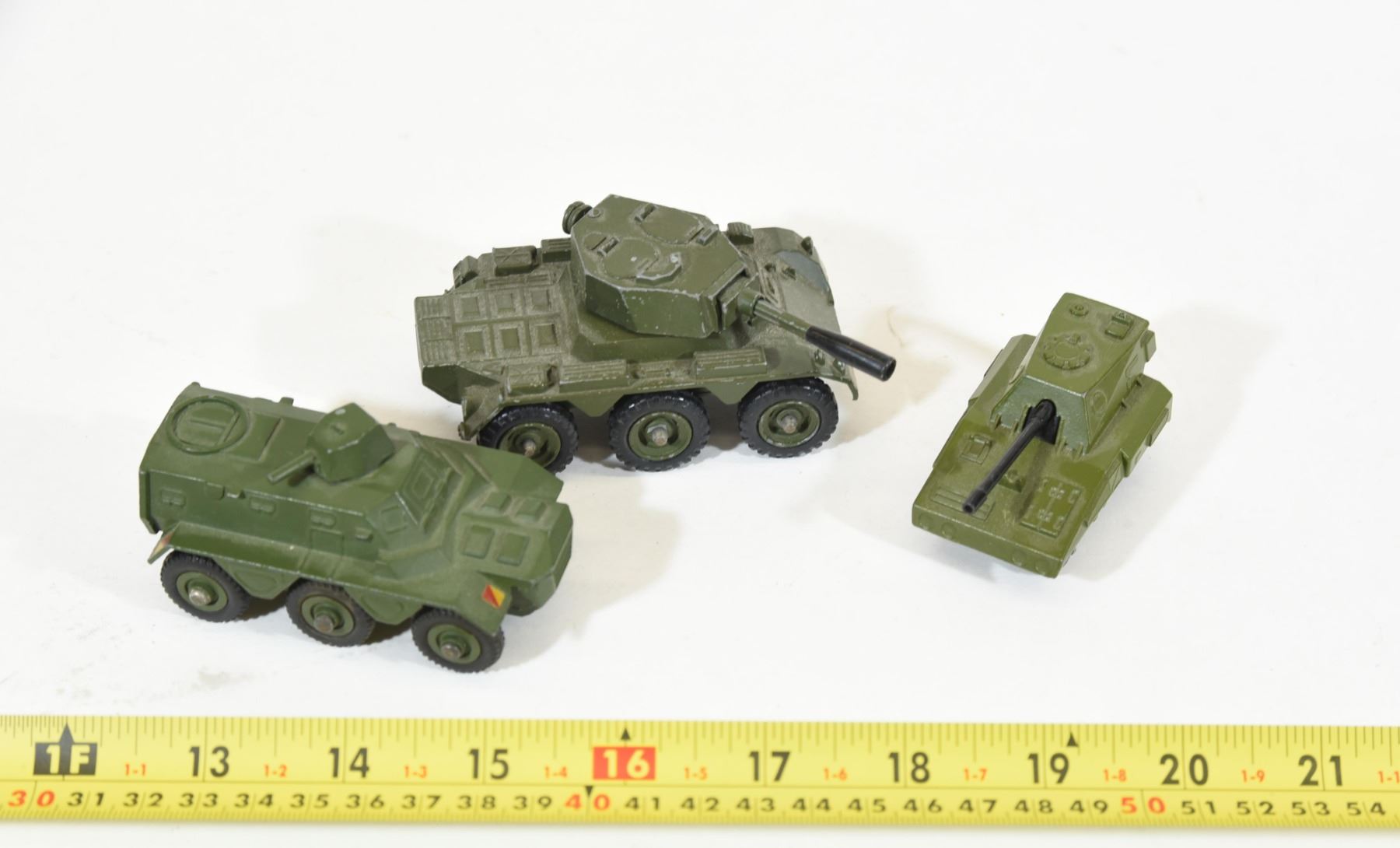 1) Saladin armoured Car 3.5" x 2". 2) Dinky Toys armoured personnel carrier 3.25" x 1.5". 3) Lesney Matchbox Rola-Matics #70 S.P. tank 2 "x 1.25".