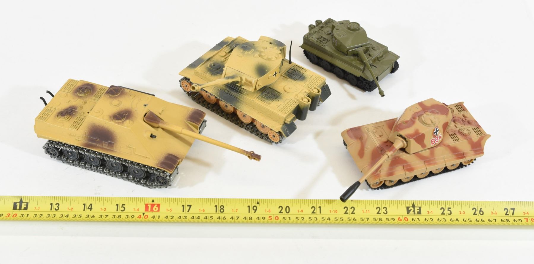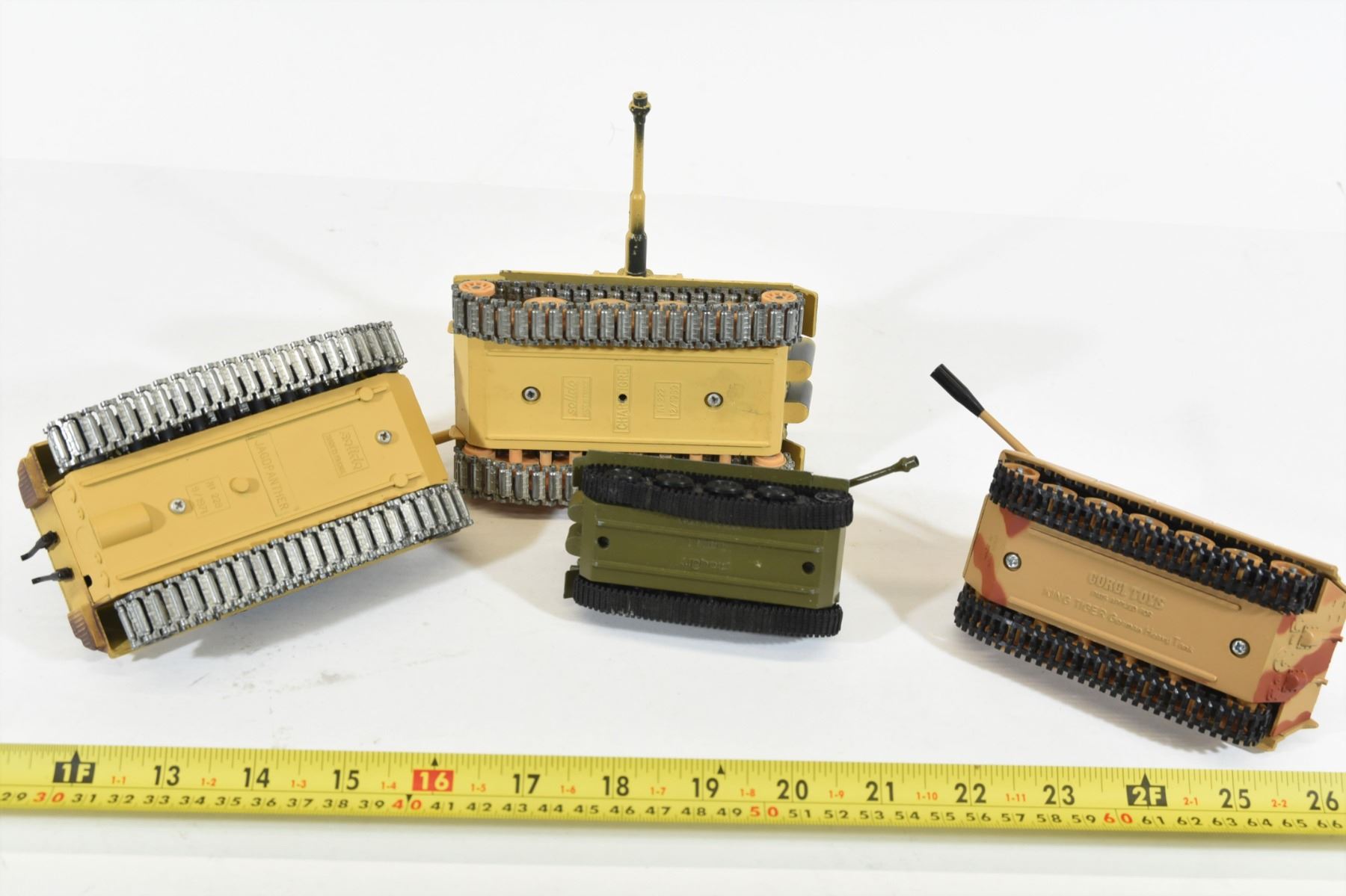 1) Solido No. 222 Char Tigre I. 7" x 3". 2) Solido No. 228B Jagdpanther Tank 8 "x 3". 3) Corgi Toys King Tiger Tank 6" x 2.5". 4) Play Art Tiger1 Tank 4" x 2".