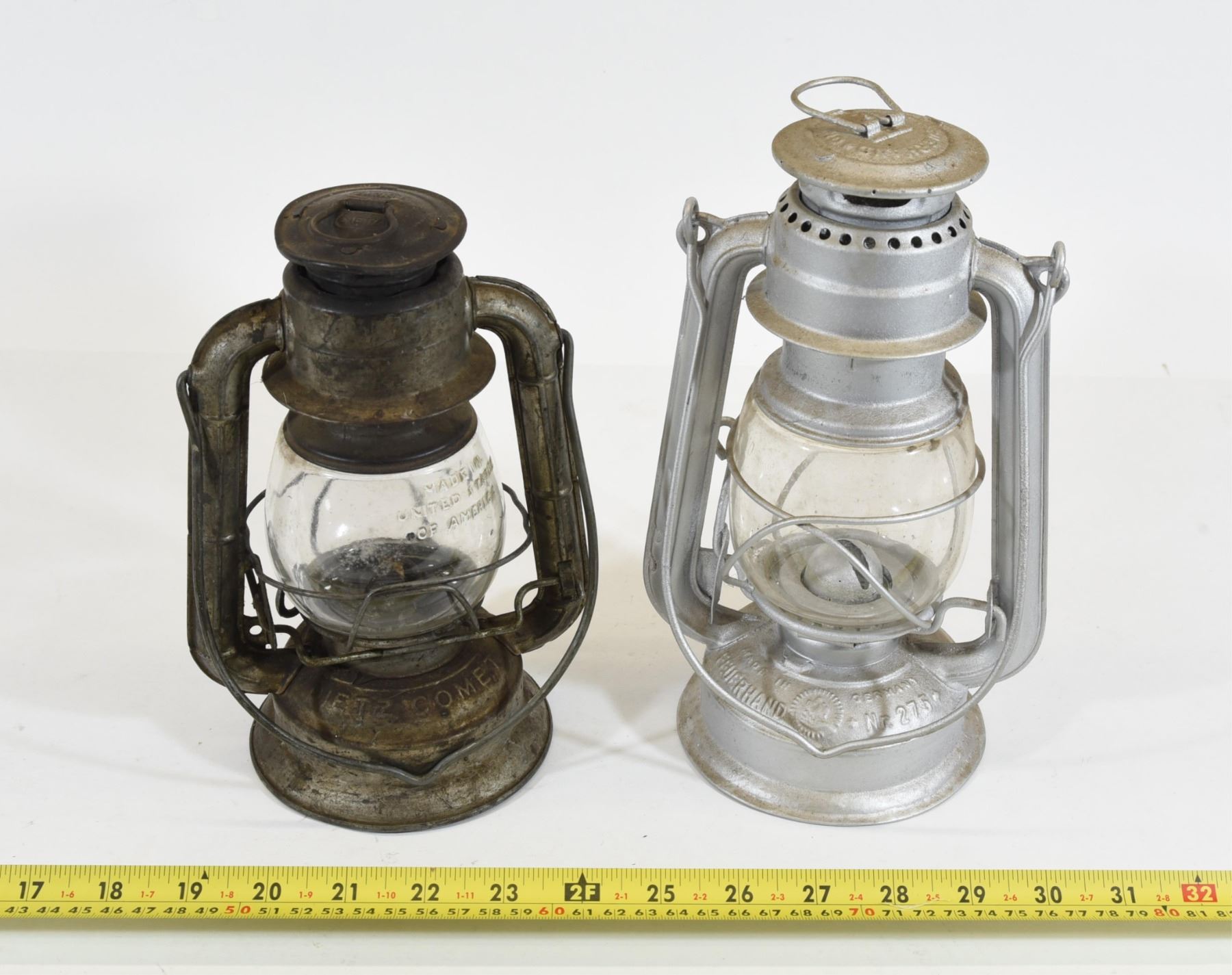 1) Dietz Comet 8.5" tall and 6" wide. 2) Feuerhand No.275 9" tall and 6" wide.