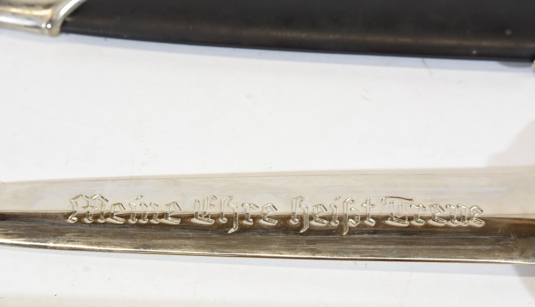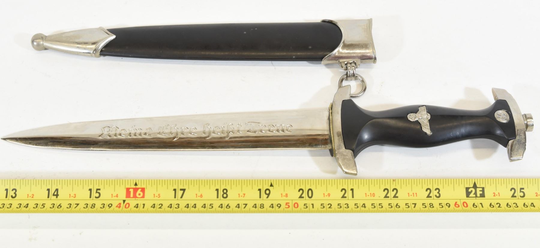 Reproduction Nazi SS dagger with sheath. Has "Mein Ehre Heißt Treue" engraving on one side of the blade and "RZM, M7/14" on the other side of the blade. Blade is 21.8cm long