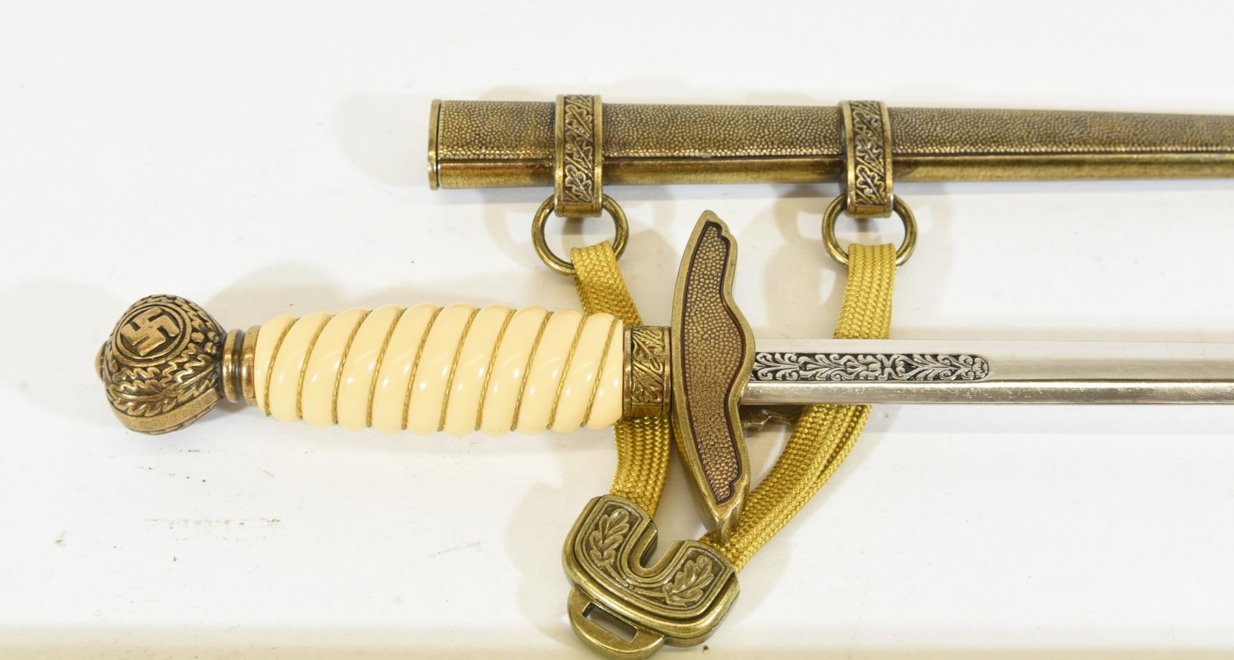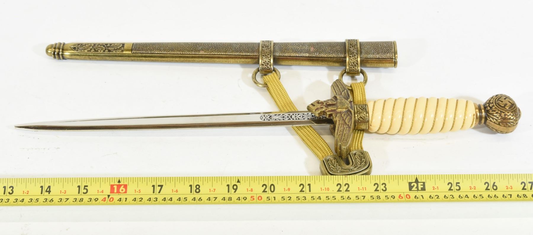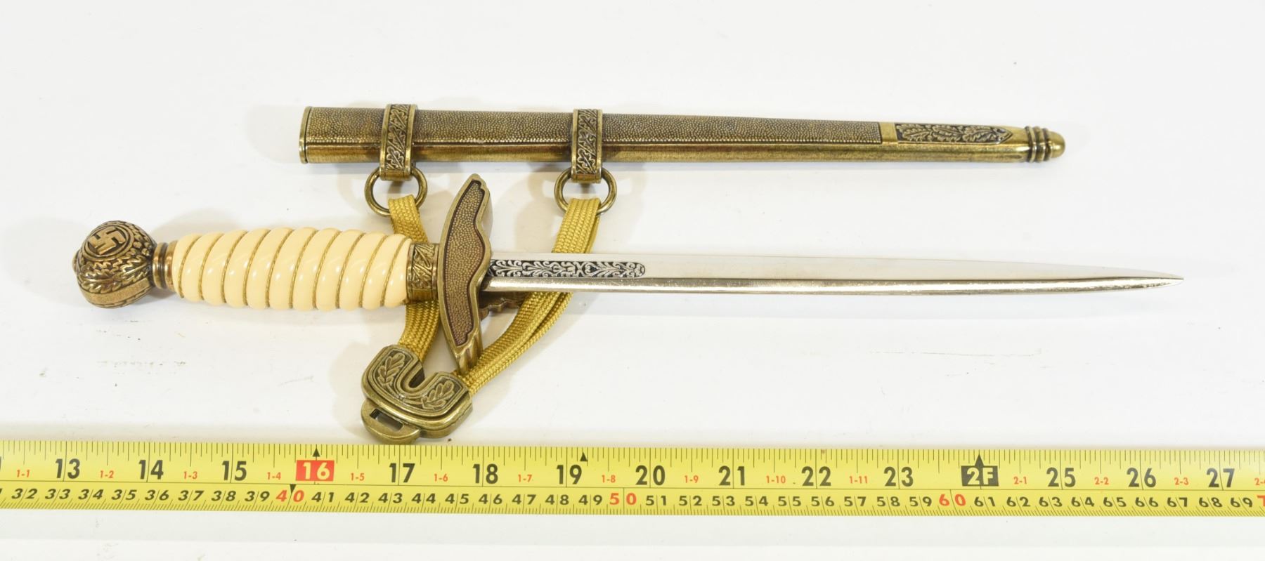 Reproduction Nazi dagger with sheath & belt chain. Blade is approximately 25cm long.