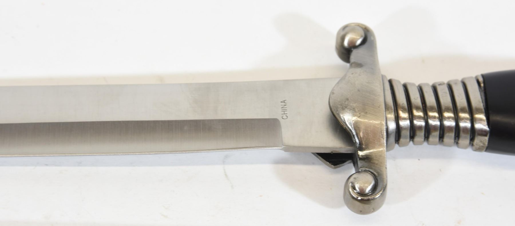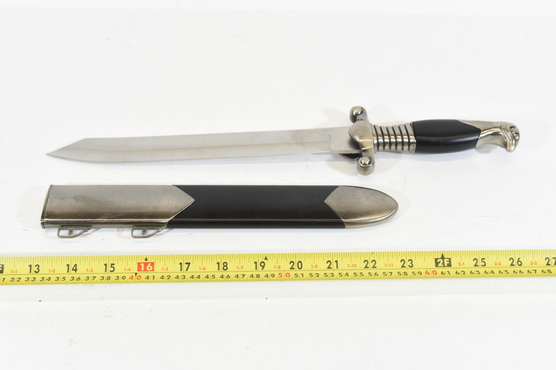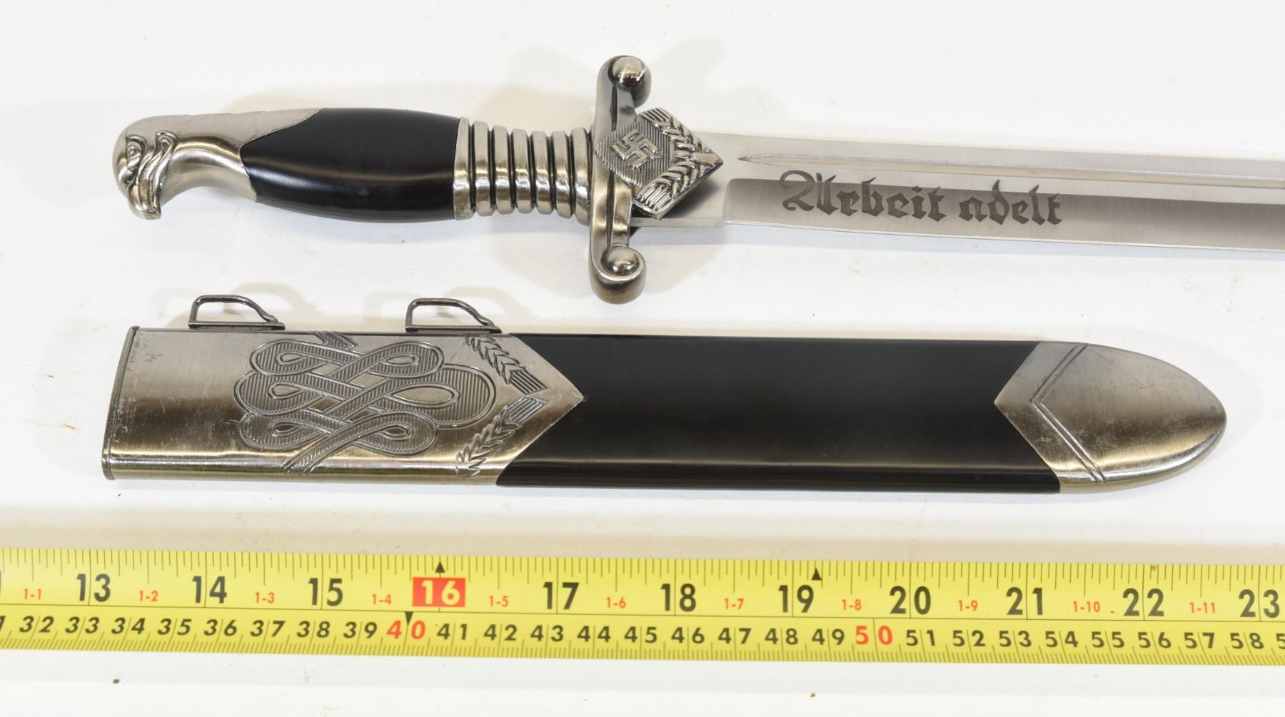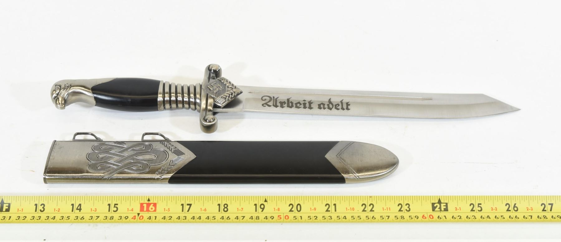 Reproduction Nazi Labor Corps dagger with sheath. Has "Arbeit Adelt" engraving on one side of the blade and "China" on the other side of the blade. Blade is 25.3cm long.