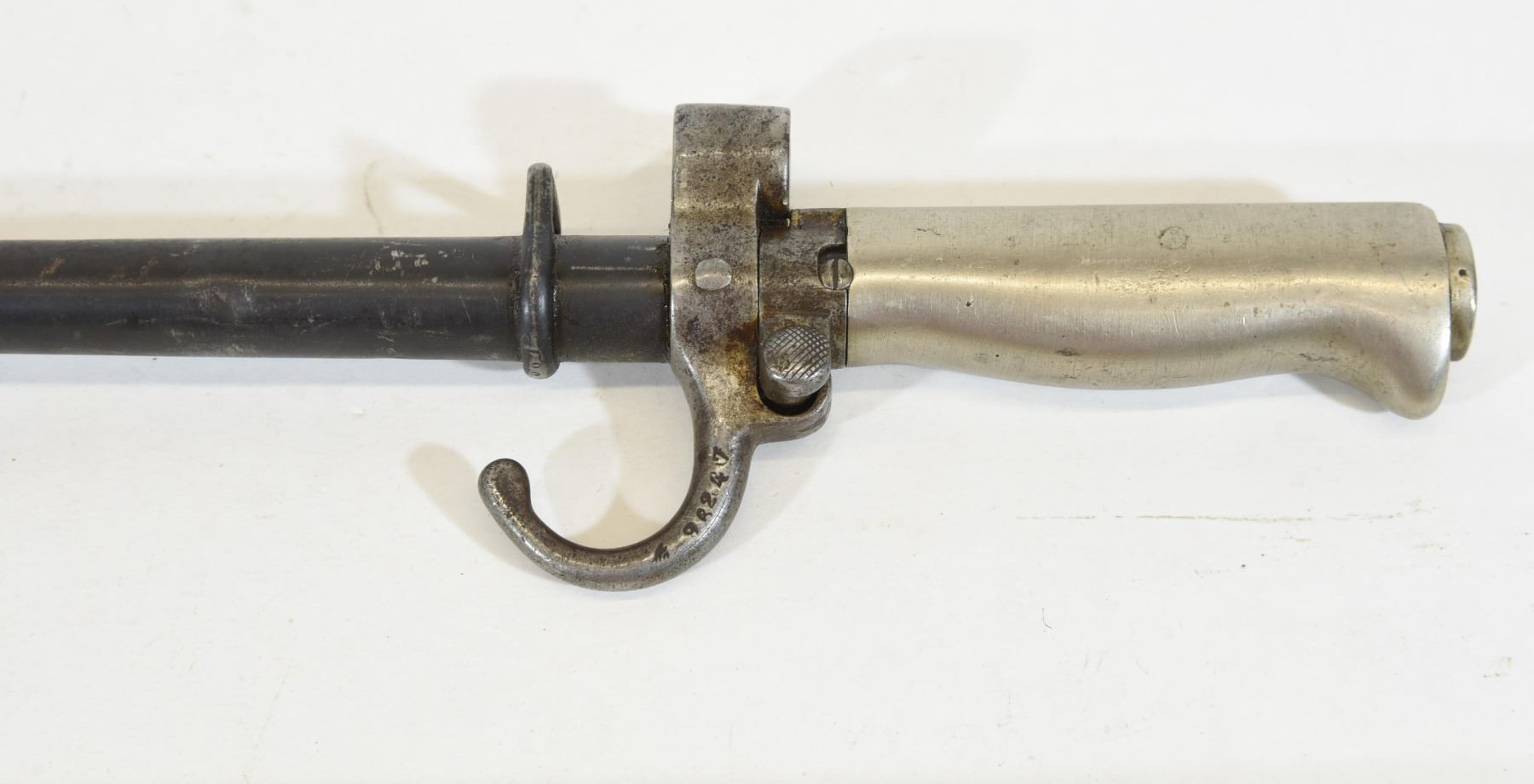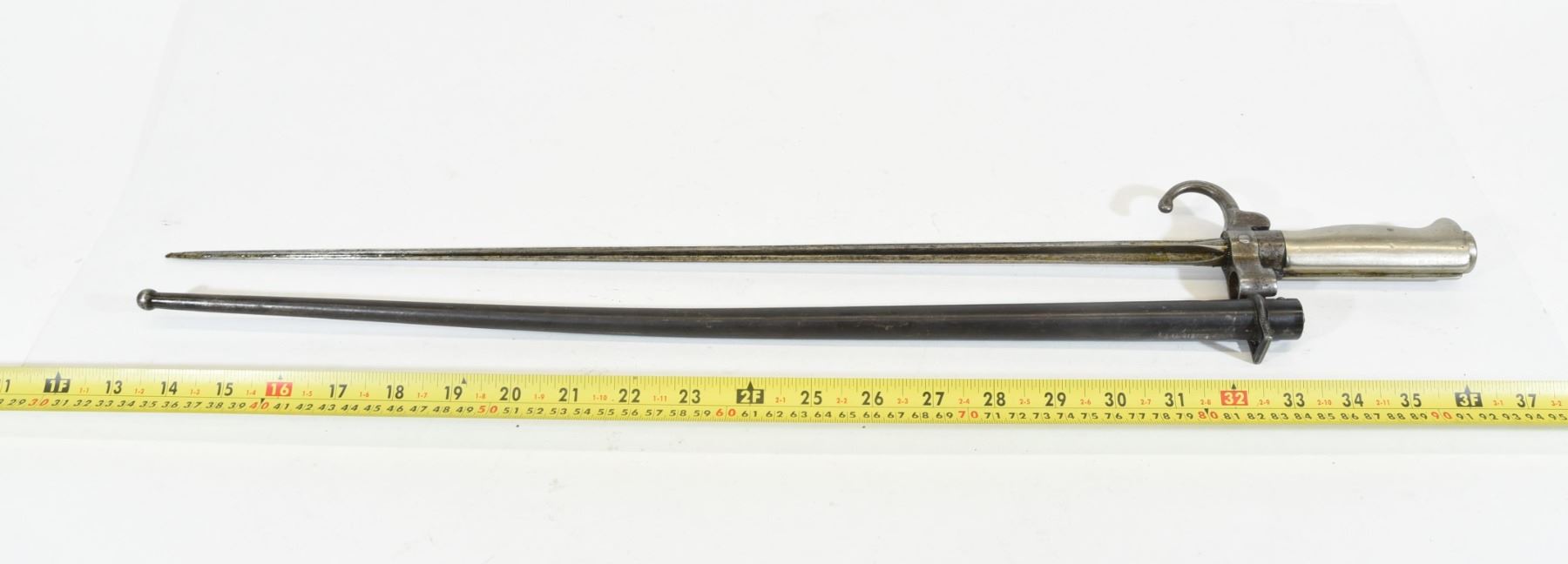 Cruciform bayonet with sheath. Serial number is 96247. Blade is 52cm long.
