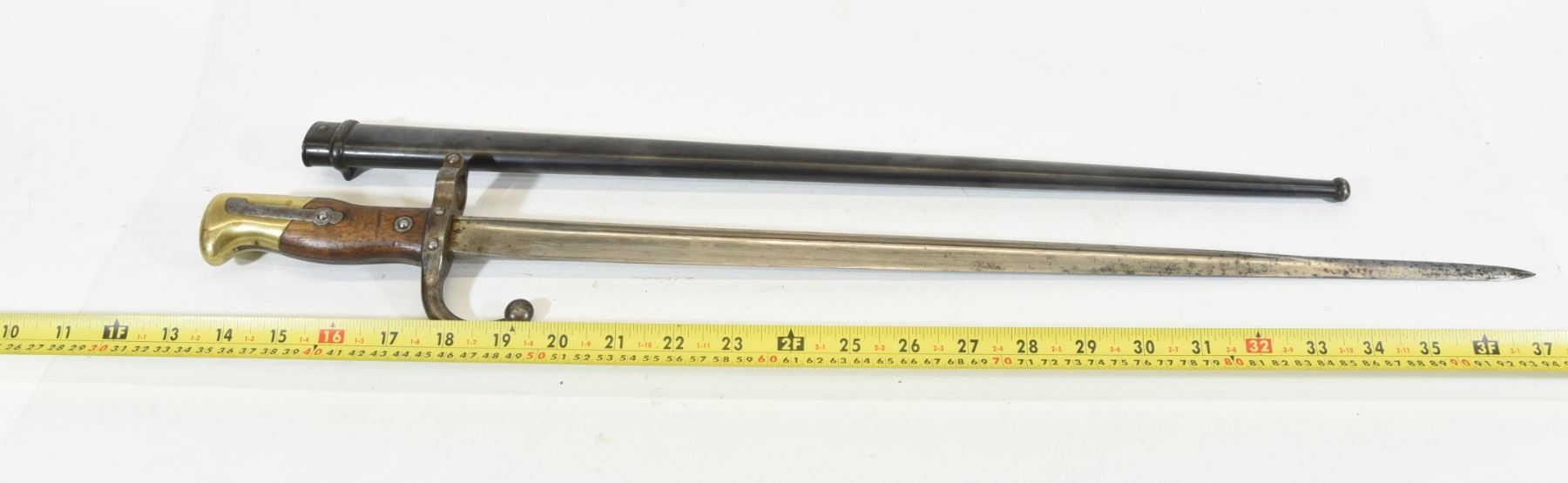 1876 Chassepott rifle bayonet with sheath. Serial number on bayonet is 21938. Serial number on sheath is EH 25573. Blade is 52cm long.