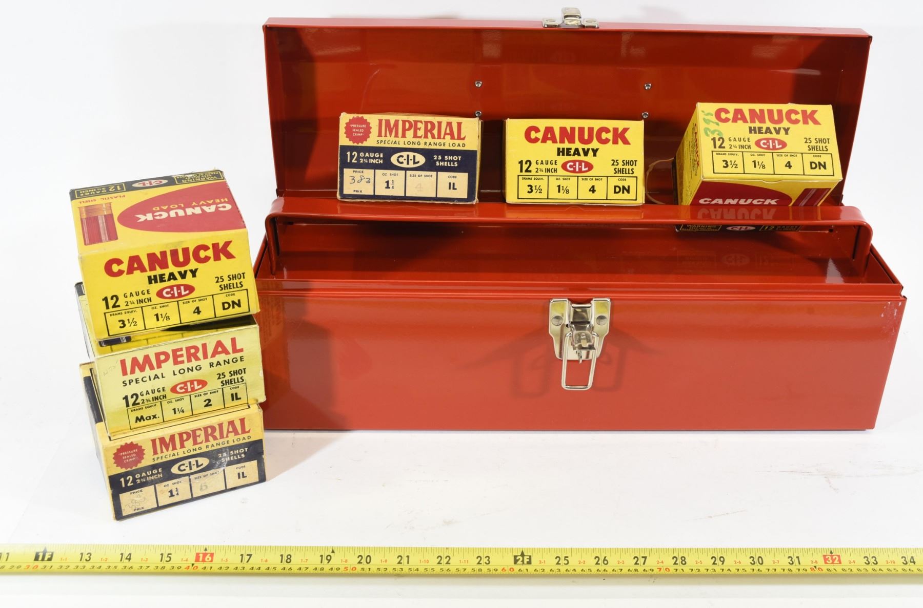 1) 73 rounds Canuck 2 3/4" #4 shot. 2) 20 rounds Imperial 2 3/4" #4 shot. 3) 18 rounds Imperial 2 3/4" #5 shot. 4) 25 rounds Mixed 2 3/4". In like new red tool box