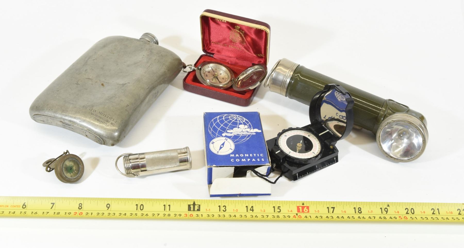 1) 3 compasses. 2) Angle flash light. 3) Waterproof matches. 4) Canteen.