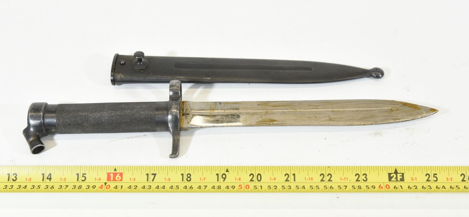 Late produced m/1896 bayonet with conical stud. Blade is 8". Overall length is 14".