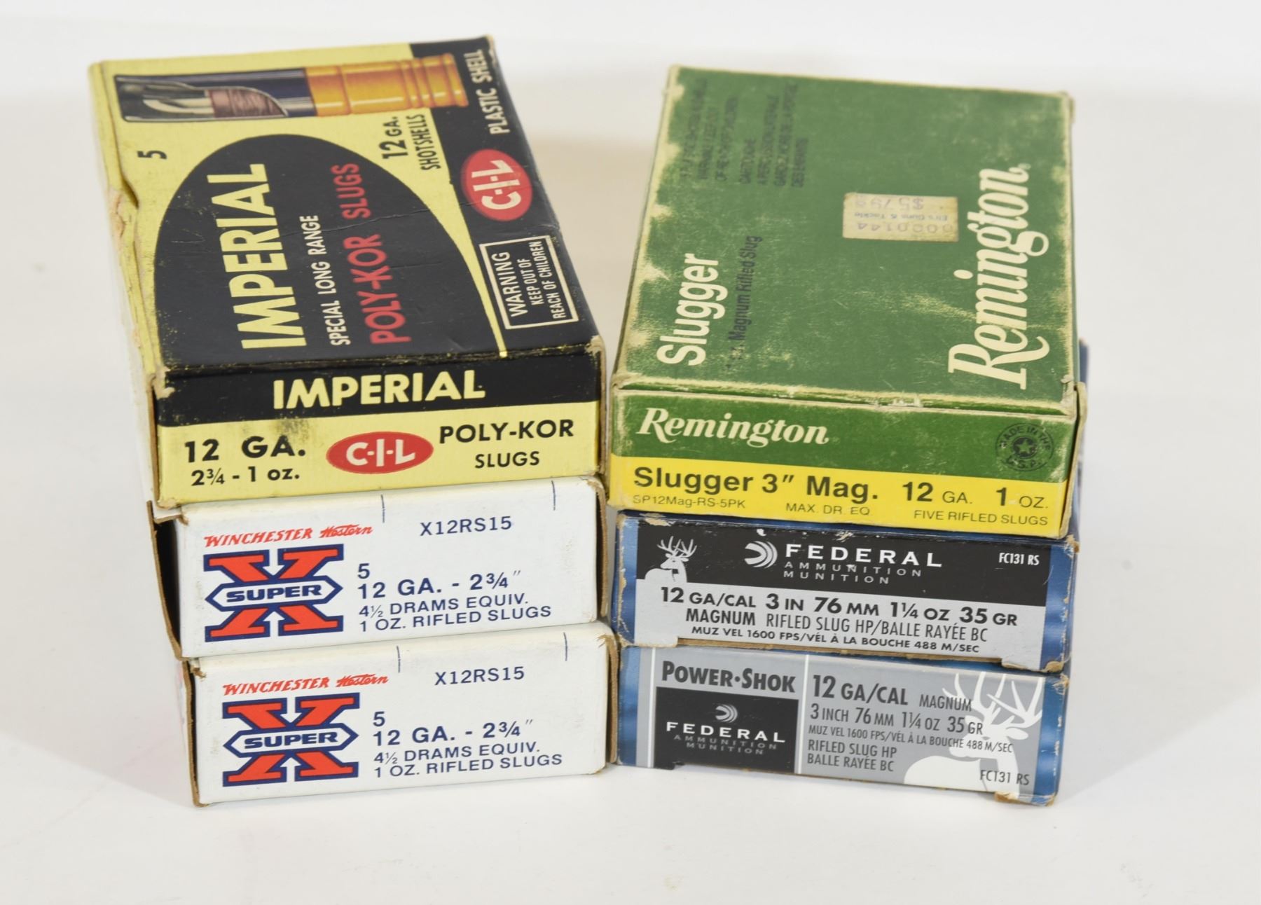 Two 5-round boxes of Winchester Super X 12ga 2 3/4" 1oz rifled slugs. Two 5-round boxes of Federal Power-Shok 12ga 3" 1 1/4oz 35gr HP rifled slugs. One 5 round box of Remington Slugger 12ga 3" 1oz Rifled Slugs. One 5 round box of CIL Imperial 12ga 2 3/4" 1oz Poly-Kor Slugs.