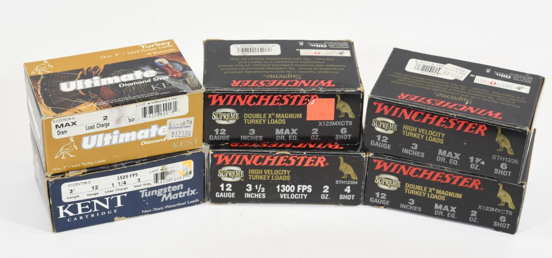 10-round box of Winchester Supreme 12ga 3" #6. 7-round box of Winchester Supreme 12ga 3" #6. 8-round box of Winchester Supreme 12ga 3" #6. 10-round box of Winchester Supreme 12ga 3.5" #4. 10-round box of Kent Ultimate Diamond Shot 12ga 3" #2. 10-round box of Kent Tungsten Matrix 12ga 3" #3.