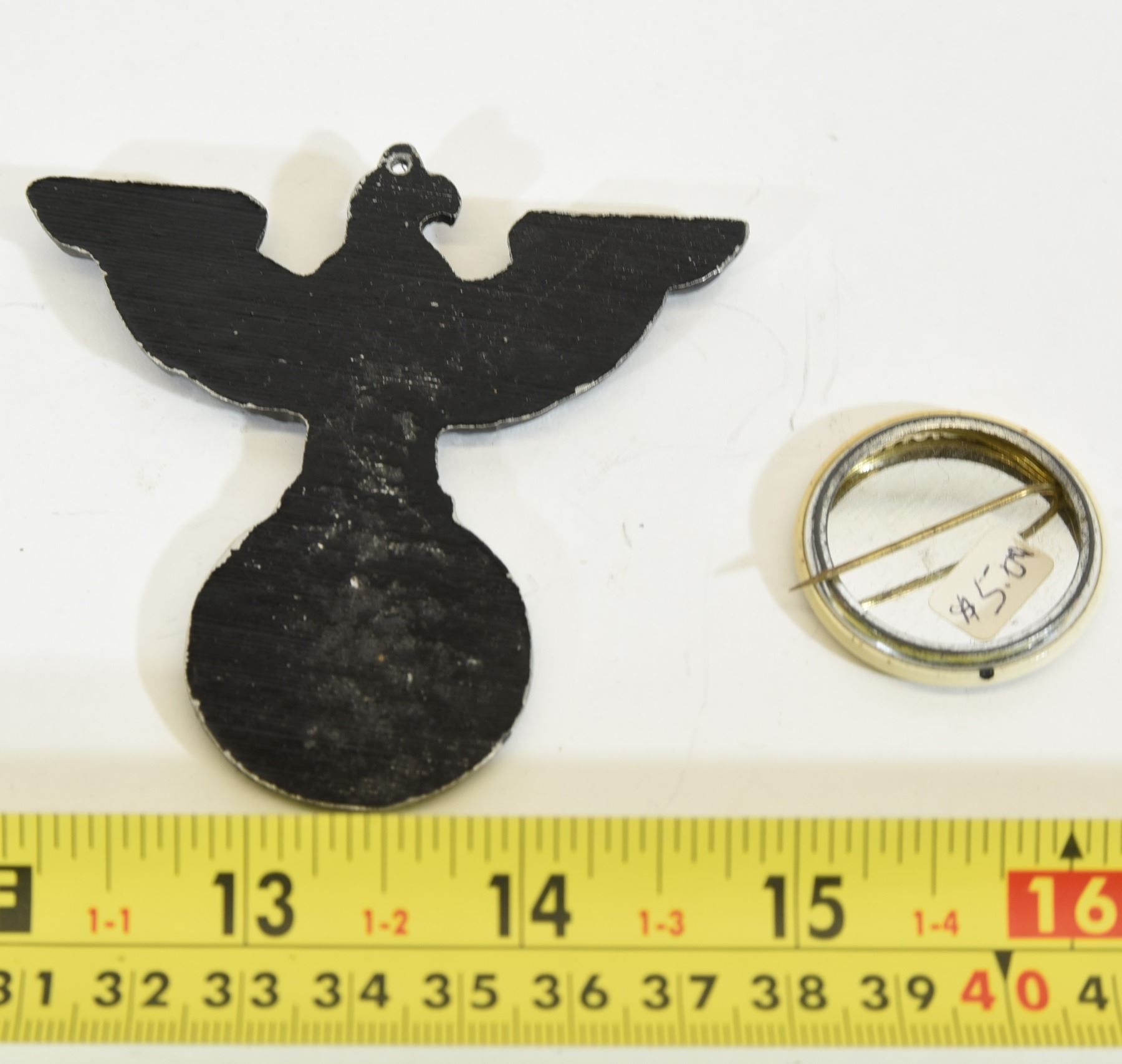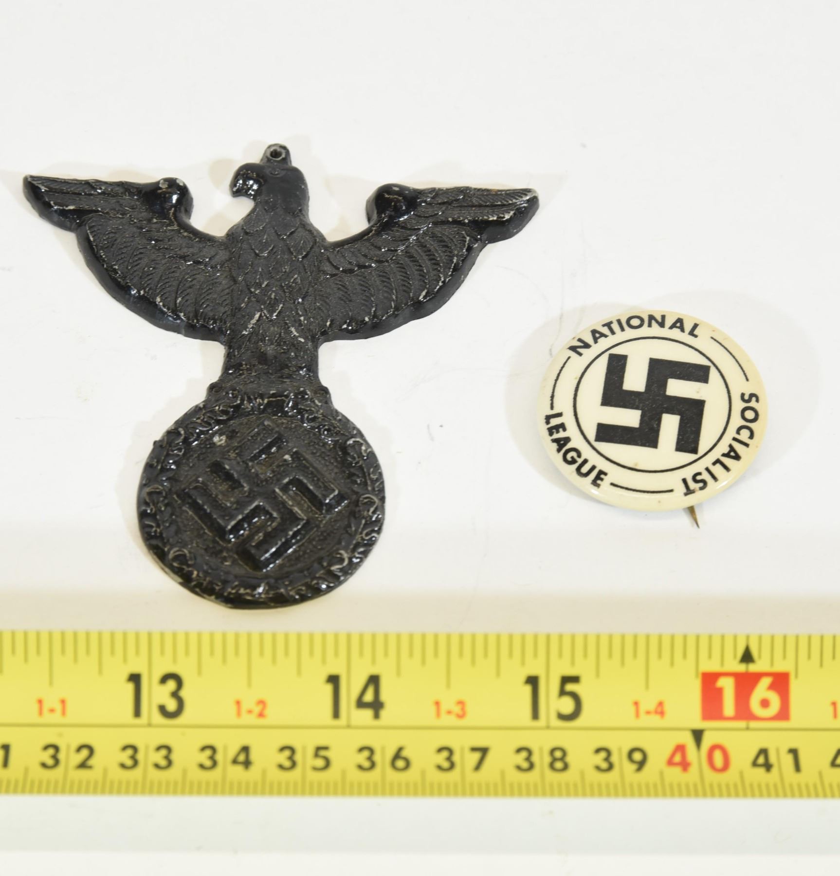 1) Reproduction Iron Cross 3" x 3". 2) National Socialist League pin 1".