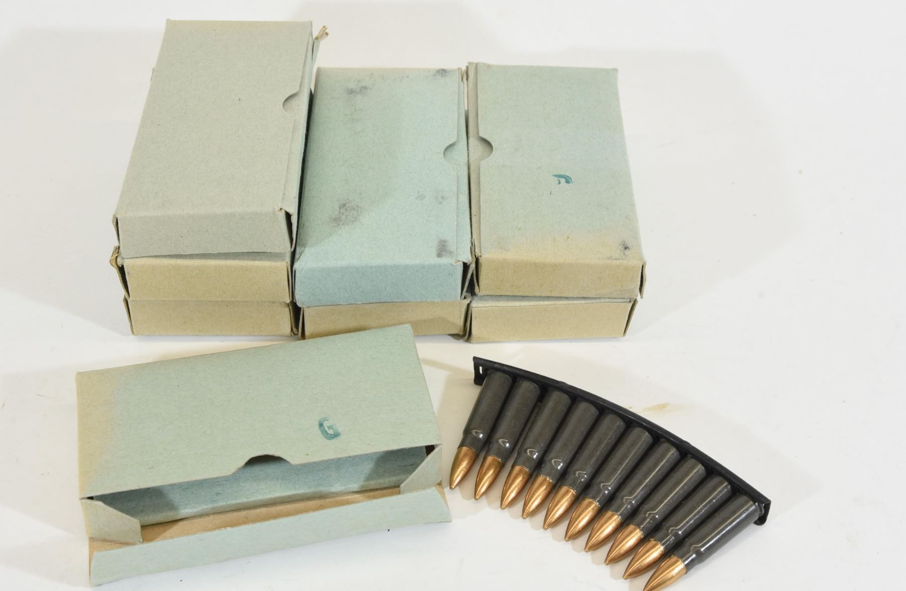 Eight 20-round boxes of 7.62x39 FMJ surplus ammunition in stripper clips.