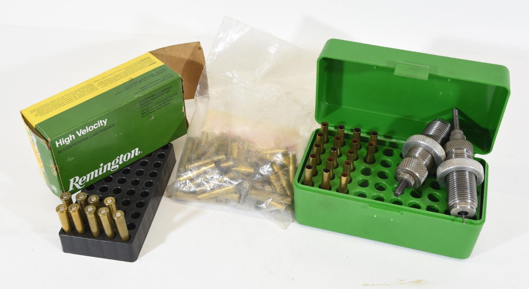 1) Set of RCBS dies. 2) 9 rounds 45gr HP. 3) 17 Primed cases. 4) 52 brass.
