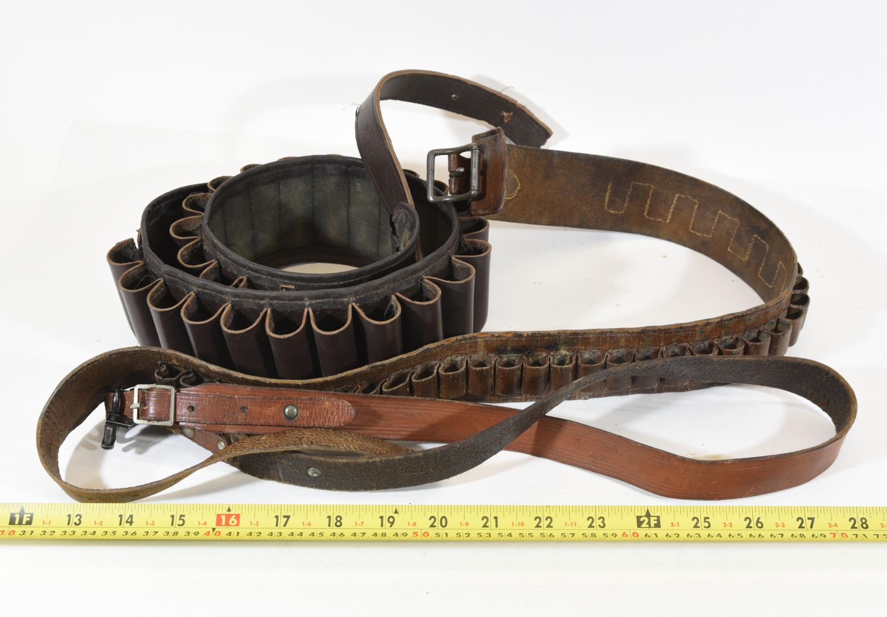 1) 12ga bandolier 42" long. Tip is broken off. 2) Rifle bandolier 39" long. 3) Rifle sling 36" long.