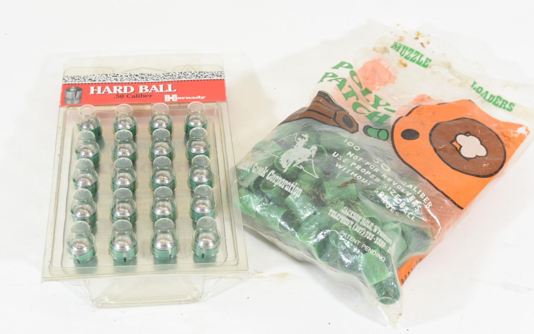 20-piece package of Hornady 50cal hard balls sabotted bullets. One unknown quantity bag of Poly-Patch 50cal sabots.