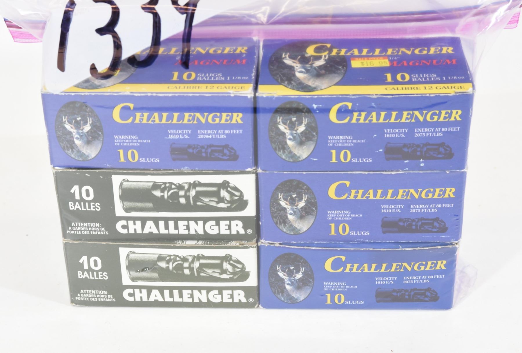 Six boxes of 10 Challenger 12 gauge 2 3/4" slugs.