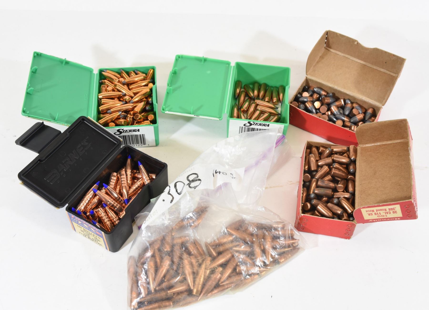 One unknown quantity box of Hornady 30cal 100gr short jacket bullets. Appears full. One unknown quantity box of Hornady 30cal .308dia 110gr round nose bullets. Appears full. 35-piece box of Barnes Tipped TSX 30cal .308dia 150gr TTSX Boattail bullets. 20-piece box of Sierra 30cal .308dia 150gr Spitzer Boat Tail bullets. One unknown quantity box of Sierra 30cal .308dia 150gr Spitzer Boat Tail bullets. Appears full. One 85-piece bag of .308dia 140gr bullets.