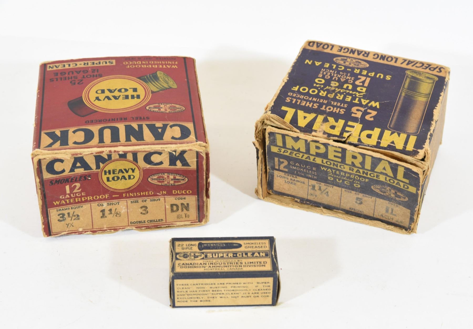 Imperial 12ga 2 3/4" #5 box. CIL Canuck 12ga #3 box. CIL Super Clean 22LR smokeless greased box.