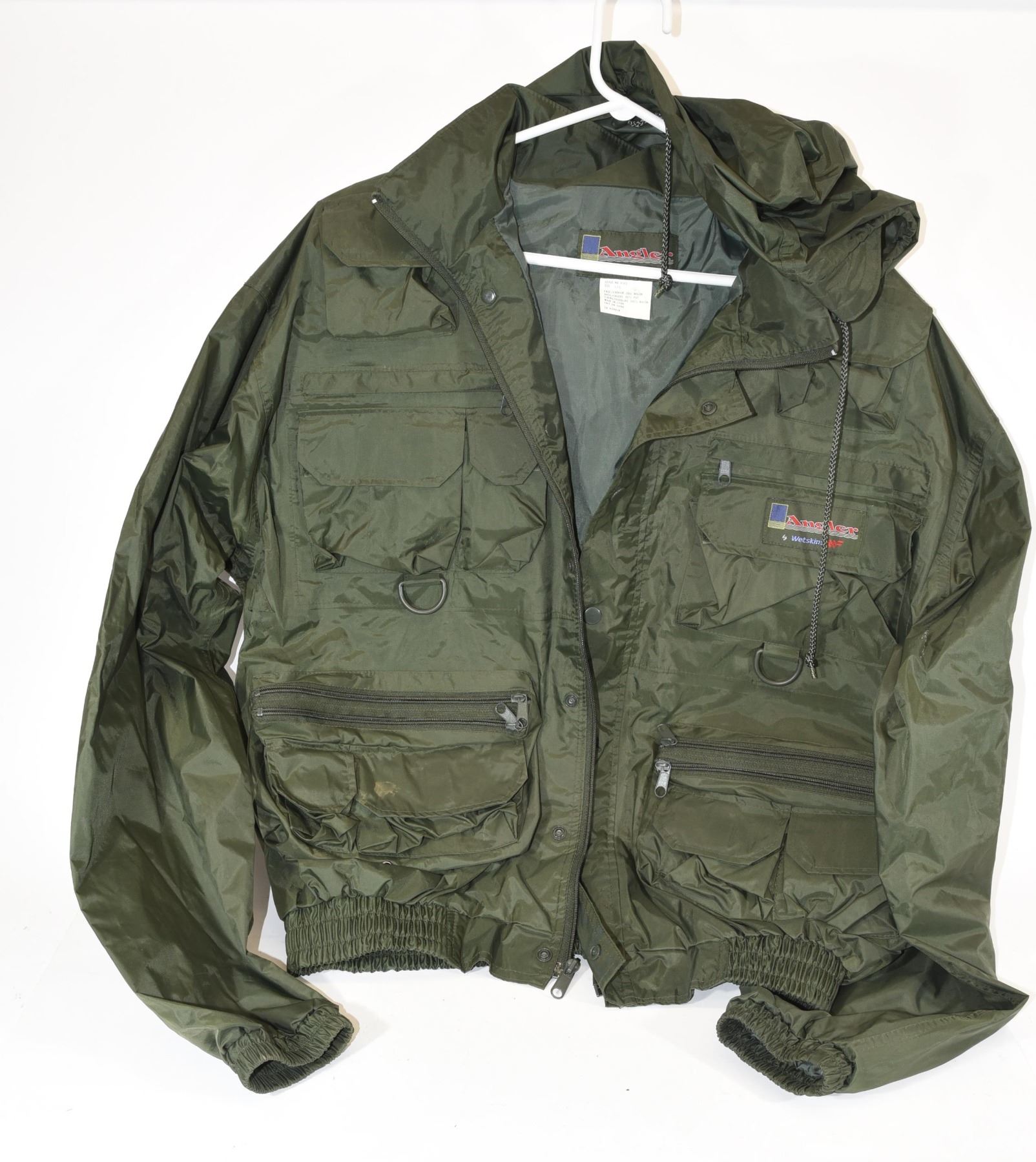 Angler Wetskins rain coat in size L. Lightweight, full-function, packable rain protection for fishing, camping, and a wide variety of other situations. Heavy-duty nylon shell with PVC laminate coating.