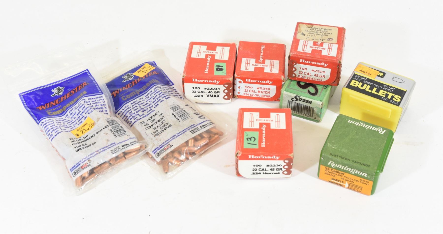 Two bags of Winchester 22 Hornet component bullet weighing .65 lbs. Two boxes of Hornady 22 cal .224 Hornet - total of 31 bullets. One box of Hornady 22 cal .223 weighing .65 lb. One box of Hornady 22 cal .224 weighing .65 lb. One box of Speer 22 cal .223 spire soft point bullets weighing .45 lb. One box of Sierra 22 cal .223 soft point Hornet bullets weighing .6 lb. One box of Remington 22 cal .224 power-lokt hollow point bullets weighing .7 lb.