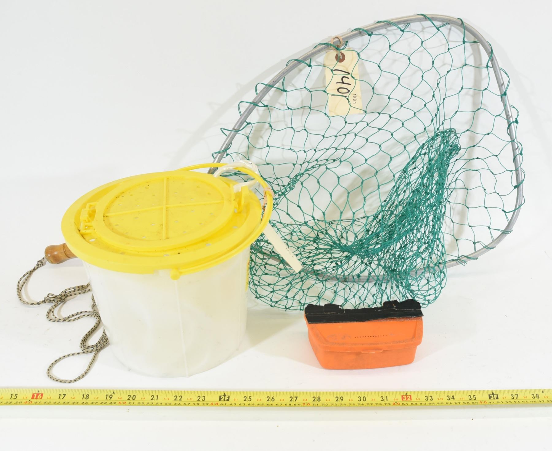 1) Belt loop worm container, 5" long and 3" deep. 2) Plastic minnow pail. 3) Landing net 28" long and 15" wide.