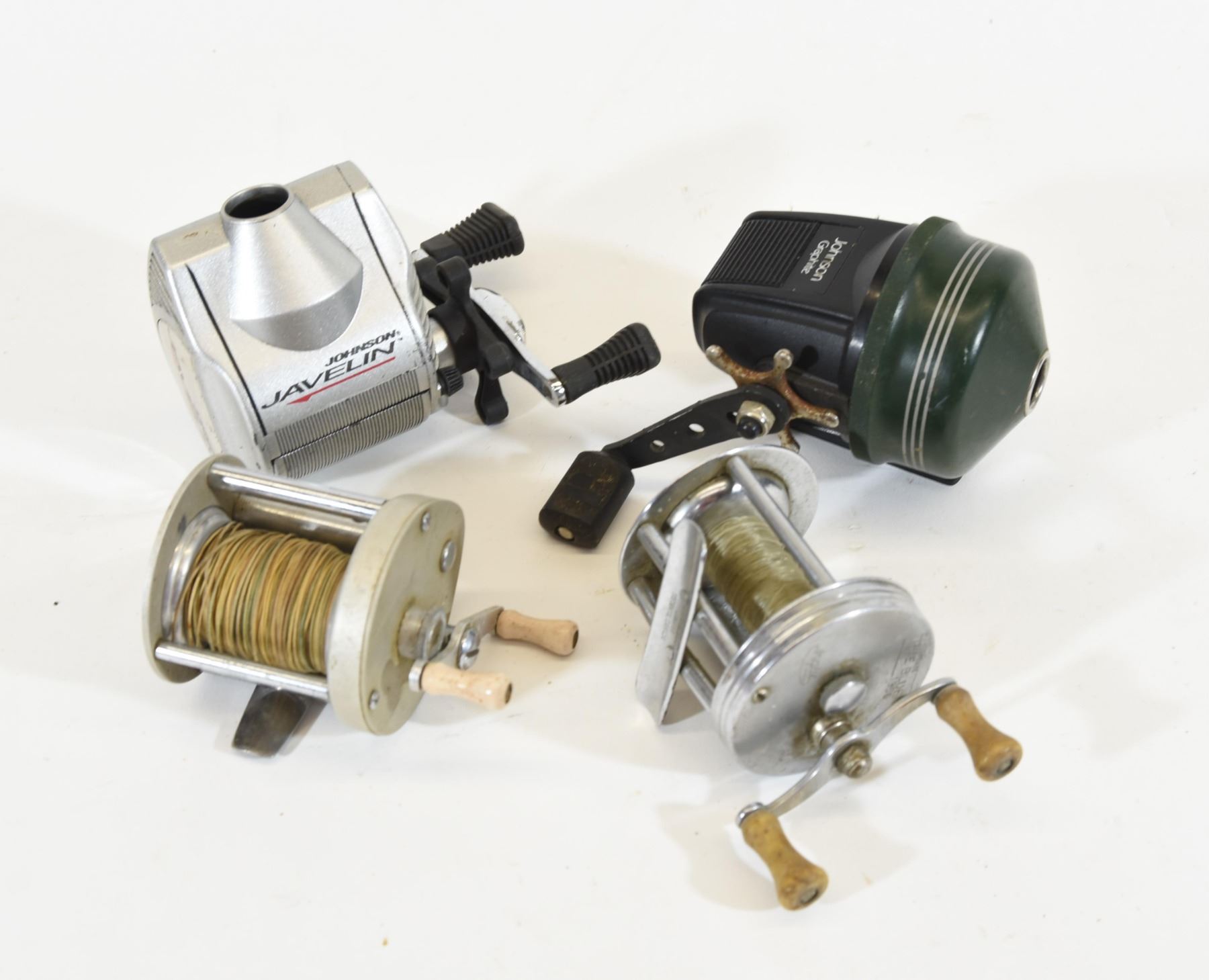 1) Johnson Javelin. Missing rear gear: non-functioning. 2) Shakespeare True Blue 1956 Model FK spool bar. Sticks at one end. 3) Johnson Tangle-Free with 10 Functions. 4) Langly Reel Cast model 500 in functioning condition.
