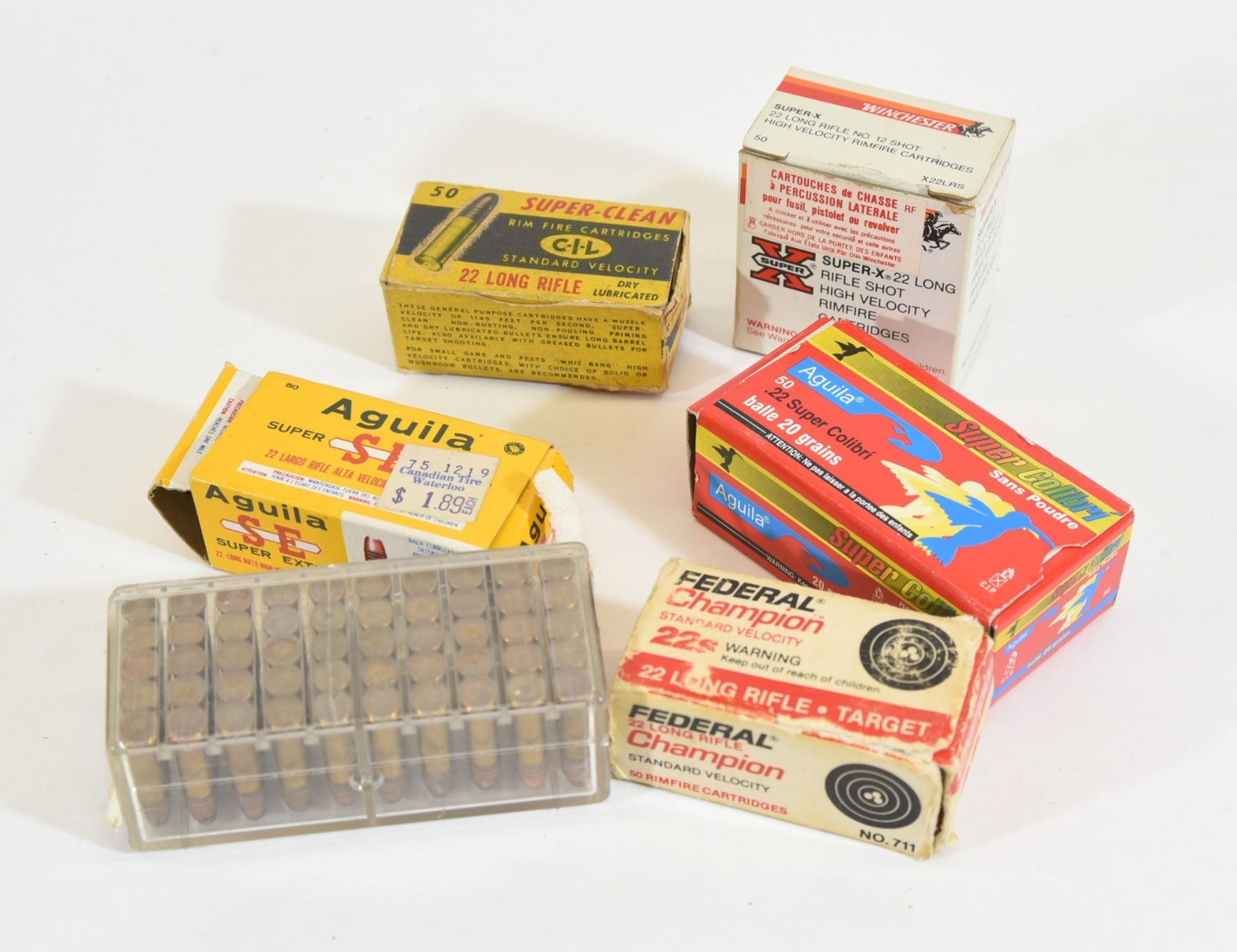 All 22LR except first item. 1) CIL box containing 6 32Auto homemade shot shells. 2) 50 rounds mixed 22LR. 3) 17 rounds Aguila LR High Velocity HP. 4) 19 rounds Federal Champion 22LR. 5) 50 rounds Aguila Super Colibri 22Short 20gr bullet. 6) 50 rounds Winchester Super X LR shot #12.