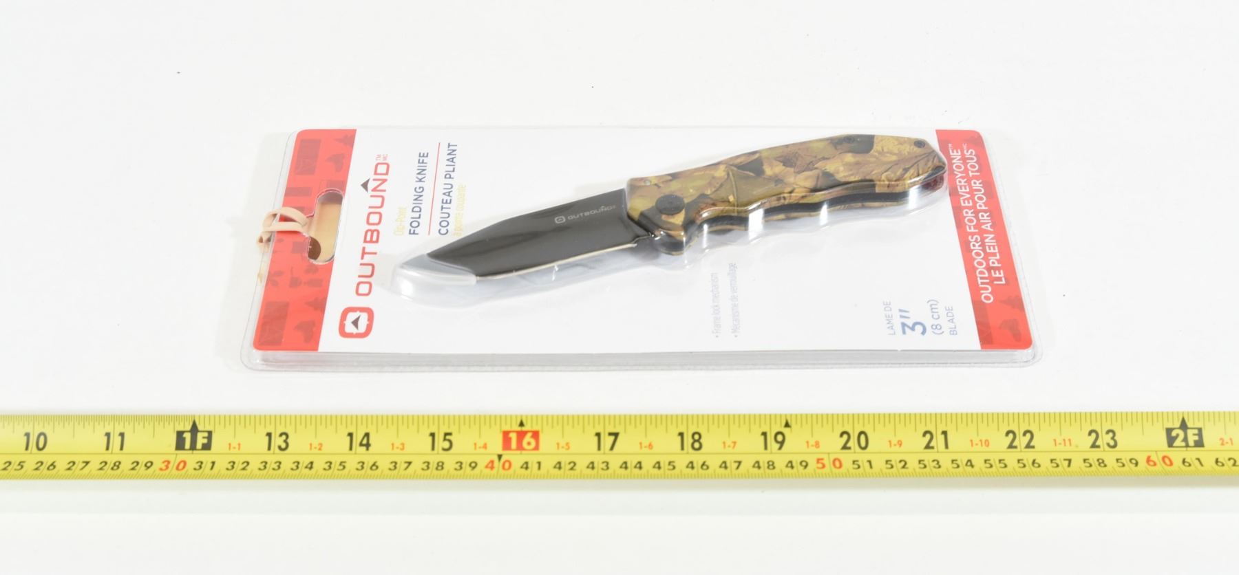 Outbound Clip-Point folding knife: 3" blade and camo handle. New in package.
