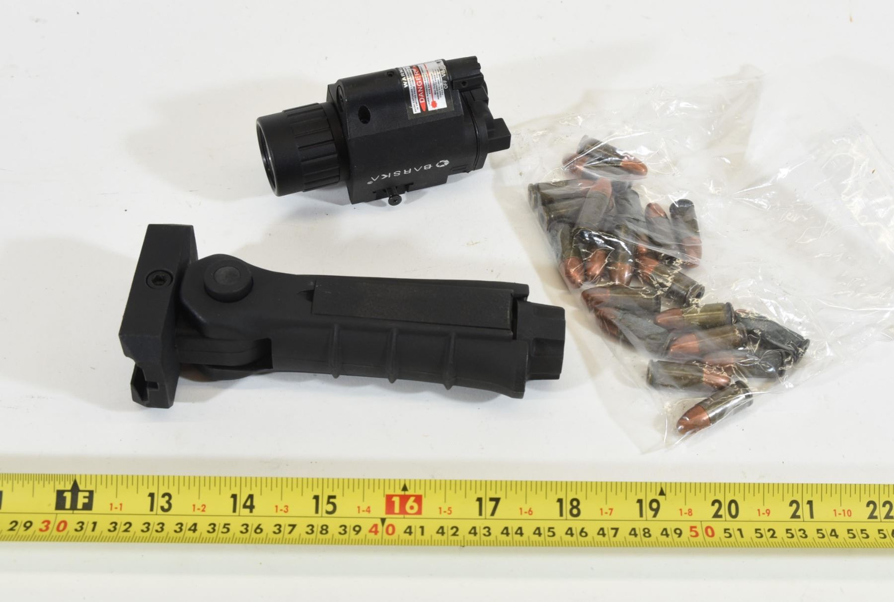 1) Folding foregrip. 2) Barska Flashlight/Laser combo (unknown function - no batteries). 3) 20 rounds 9mm non firing training rounds.