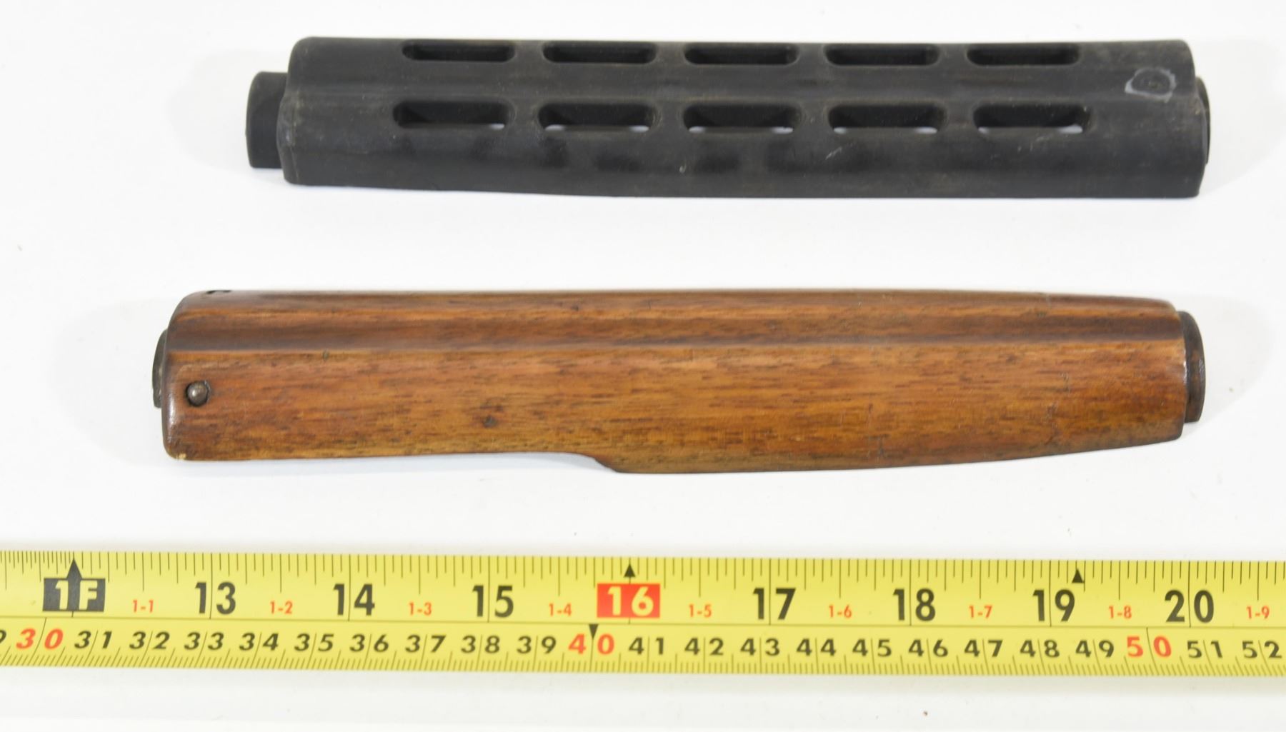 1) WWII era wooden top piece in good condition. 2) Synthetic top piece in good condition.