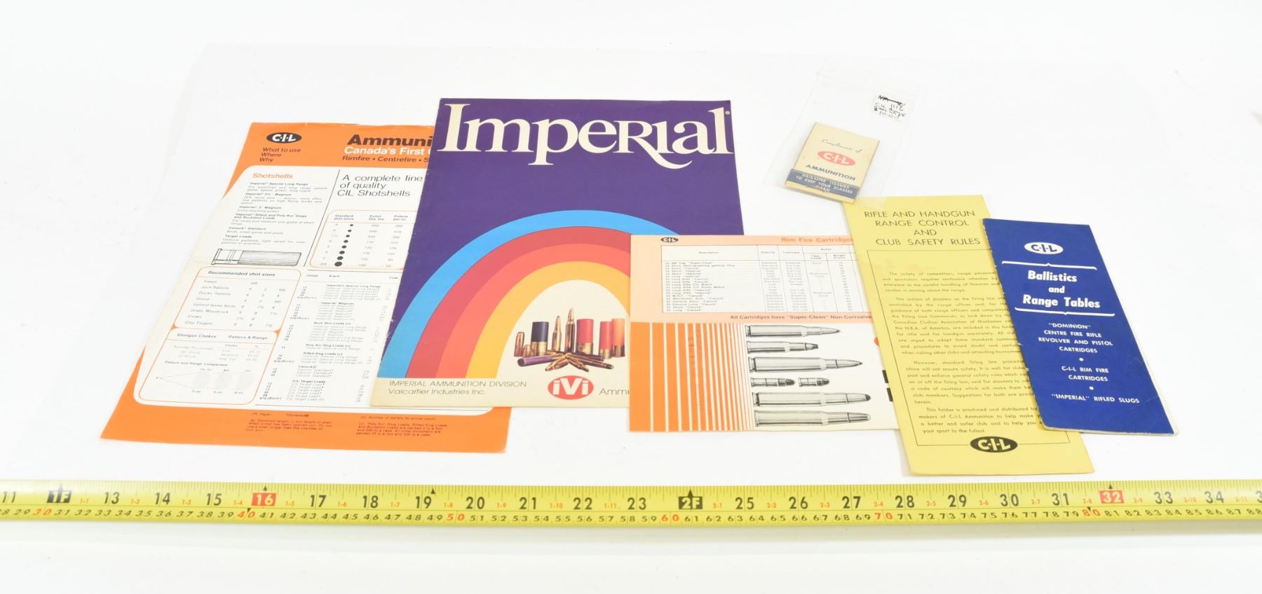 CIL ballistics & range table from 1958. CIL rifle & handgun range club rules from 1960. CIL ballistics & range table from 1962. CIL ammunition folder from 1967. IVI imperial 1977 ammunition catalogue (first catalogue after CIL). Pack of CIL glass wipes.