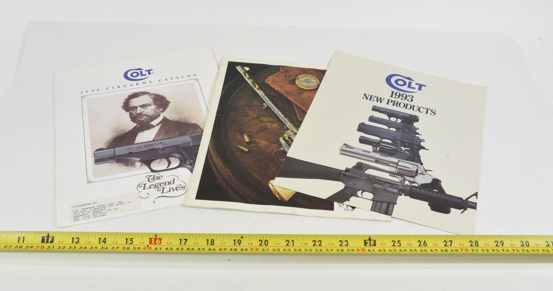 Copy of Colt Firearms 1986 catalogue. Ccopy of Colt Firearms 1991 catalogue. Copy of Colt Firearms 1993 new products brochure.