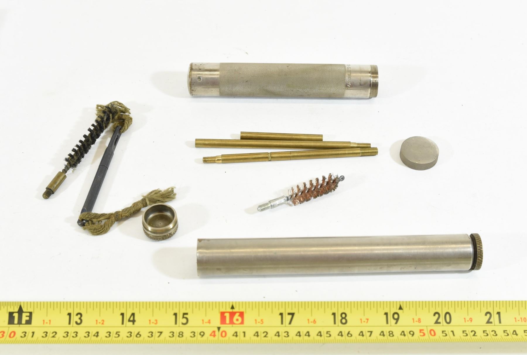 One Marble's No. 99 pistol cleaning kit in knurled metal case. One military oiler & celmer tips in metal case.