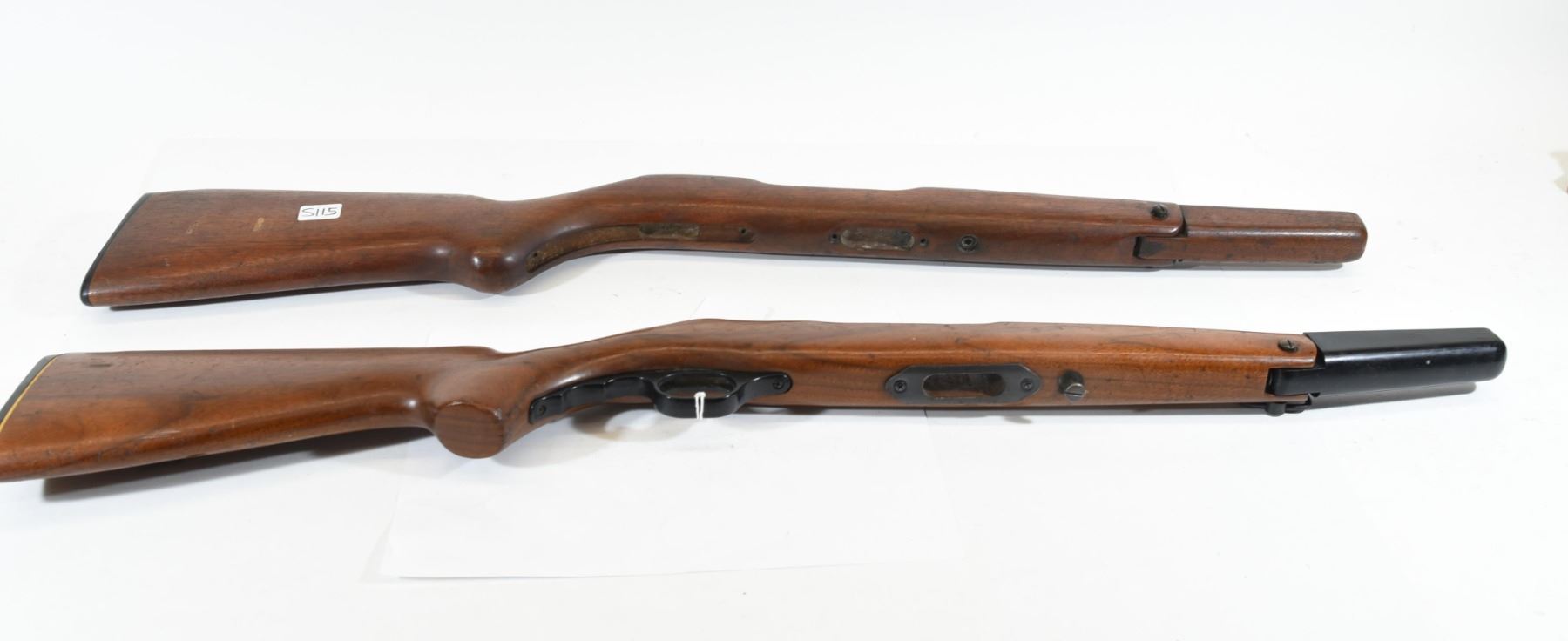 Two wooden Mossberg rifle stocks with folding forearms. (One has a trigger guard while the other does not).