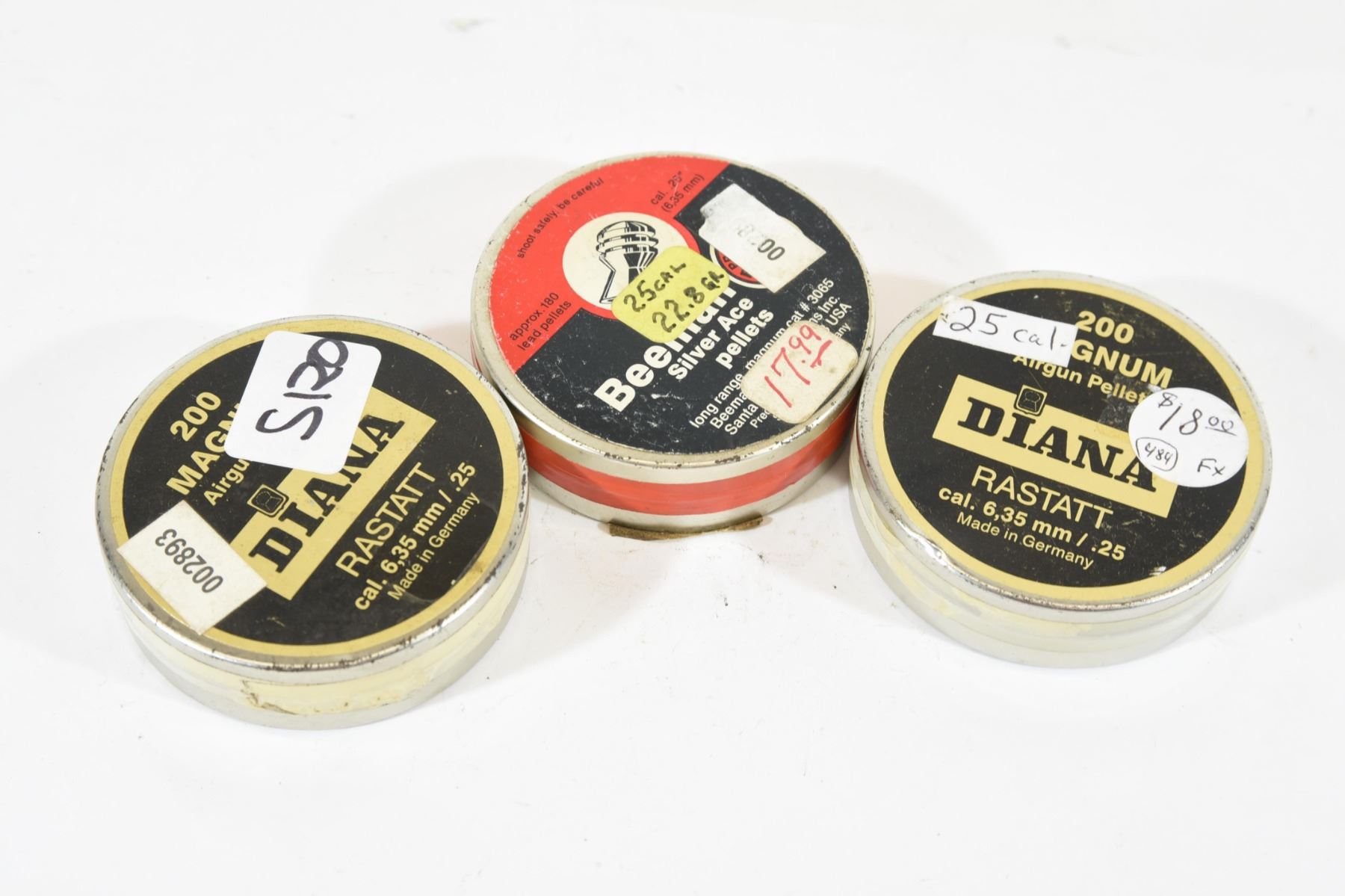 Two 200-piece tins of Diana 25cal pellets. One 180-piece tin of Beeman 25cal pellets.
