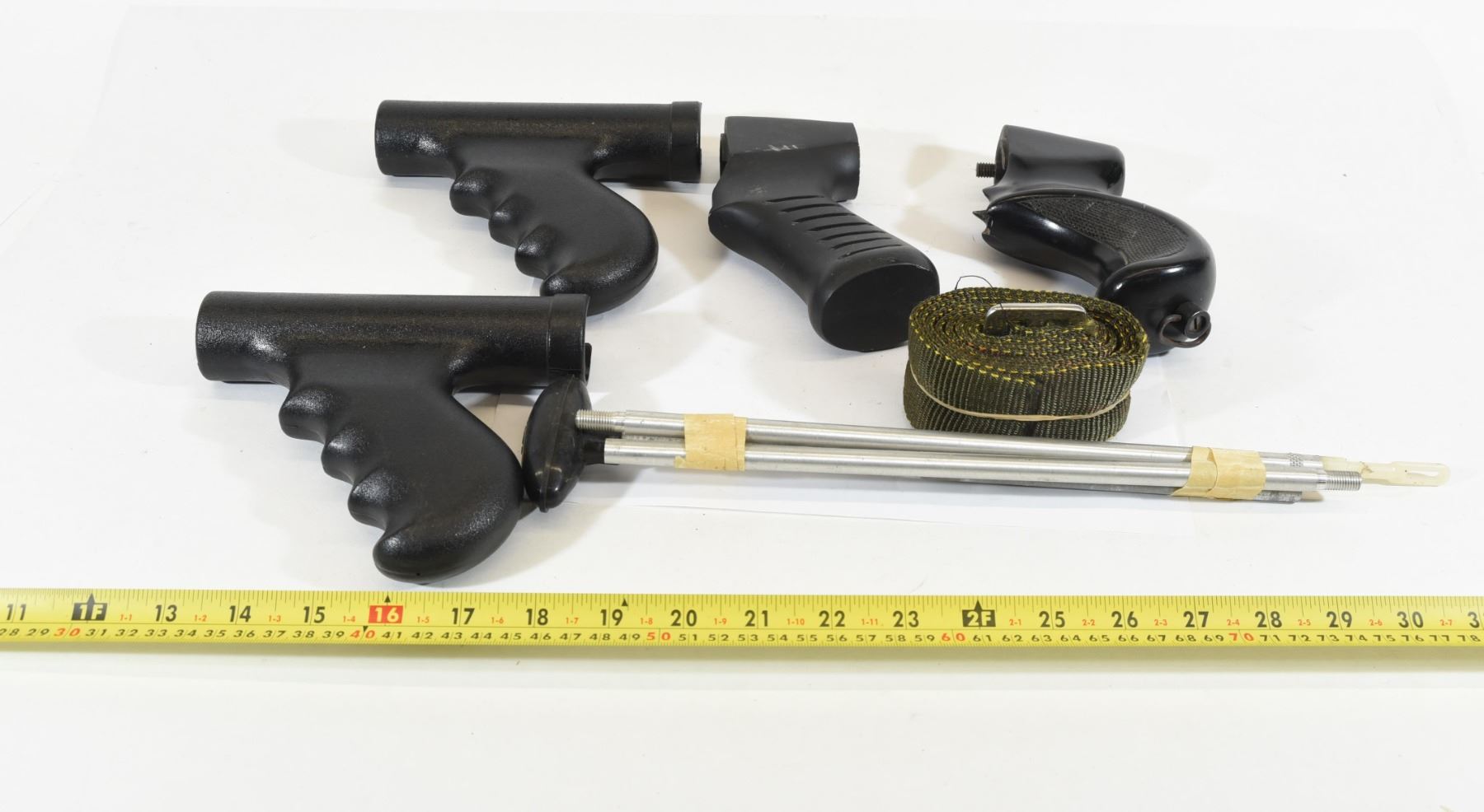 1) 2 shotgun pistol grips. 2) 2 shotgun forearm pump pistol grips. 3) Shotgun cleaning rod. 4) Nylon belt.