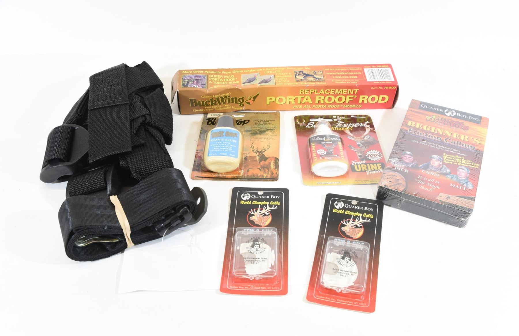 1) 2 tree stand safety belts. 2) Buck stop deer lure 1 1/4 ounces. 3) Buckwing replacement Porta Roof Rod. 4) 2 Quaker Boy Elk cow & calf diaphragm calls. 5) Quaker Boy VHS tape Beginners Friction Calling. 6) Buck Expert Whitetail buck lure, doe in heat 1 1/4 ounces.