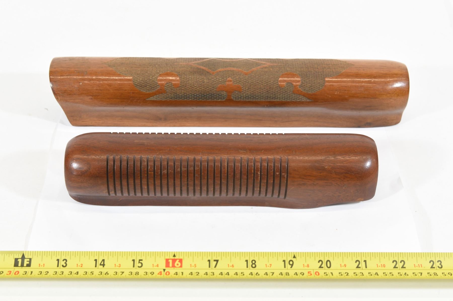 One Remington 870 12ga ribbed forearm with several dents and scratches but no cracks or chips. One Remington 1100 12ga forearm with many small scratches and one large dent near the action beside a 4.5" crack.