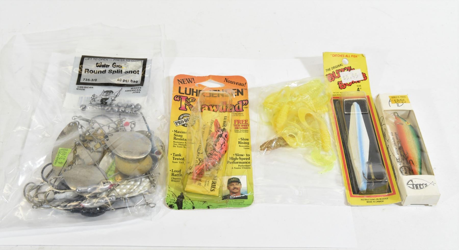 12 assorted spinner baits, 12 rubber grubs, 13 small split shot sinkers, Luhr-Jensen Klawdad, Buzz Bomb and a diving shiner lure.