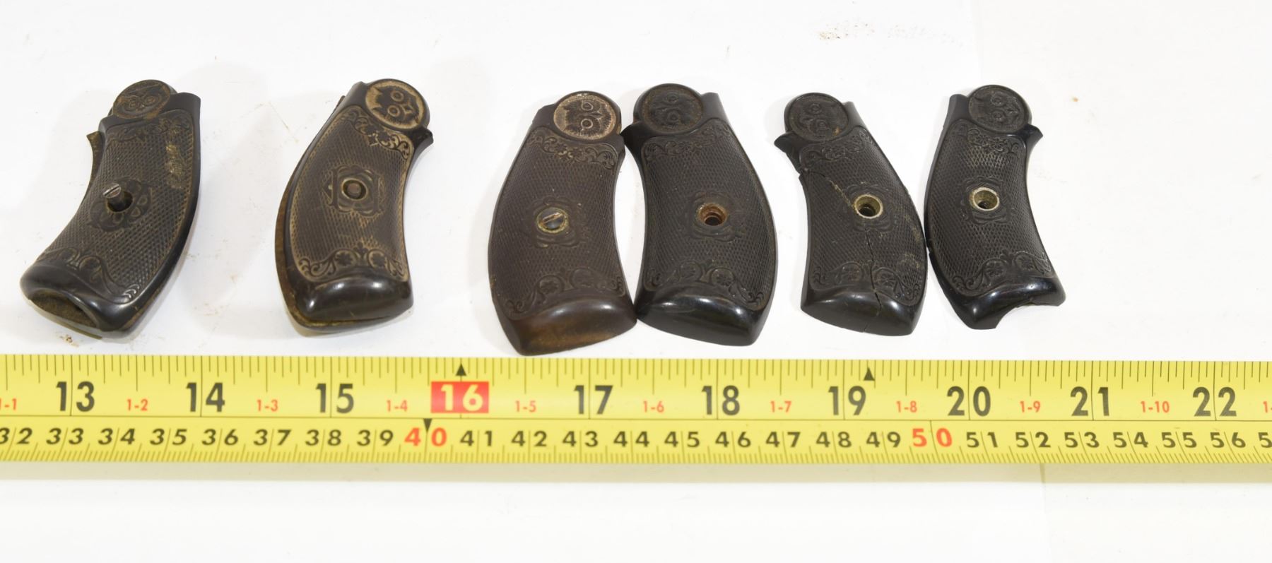 1 set has a broken left side grip that has been glued. 2 sets have no screw. The right grip on one set appears to have to glue on the inside right.