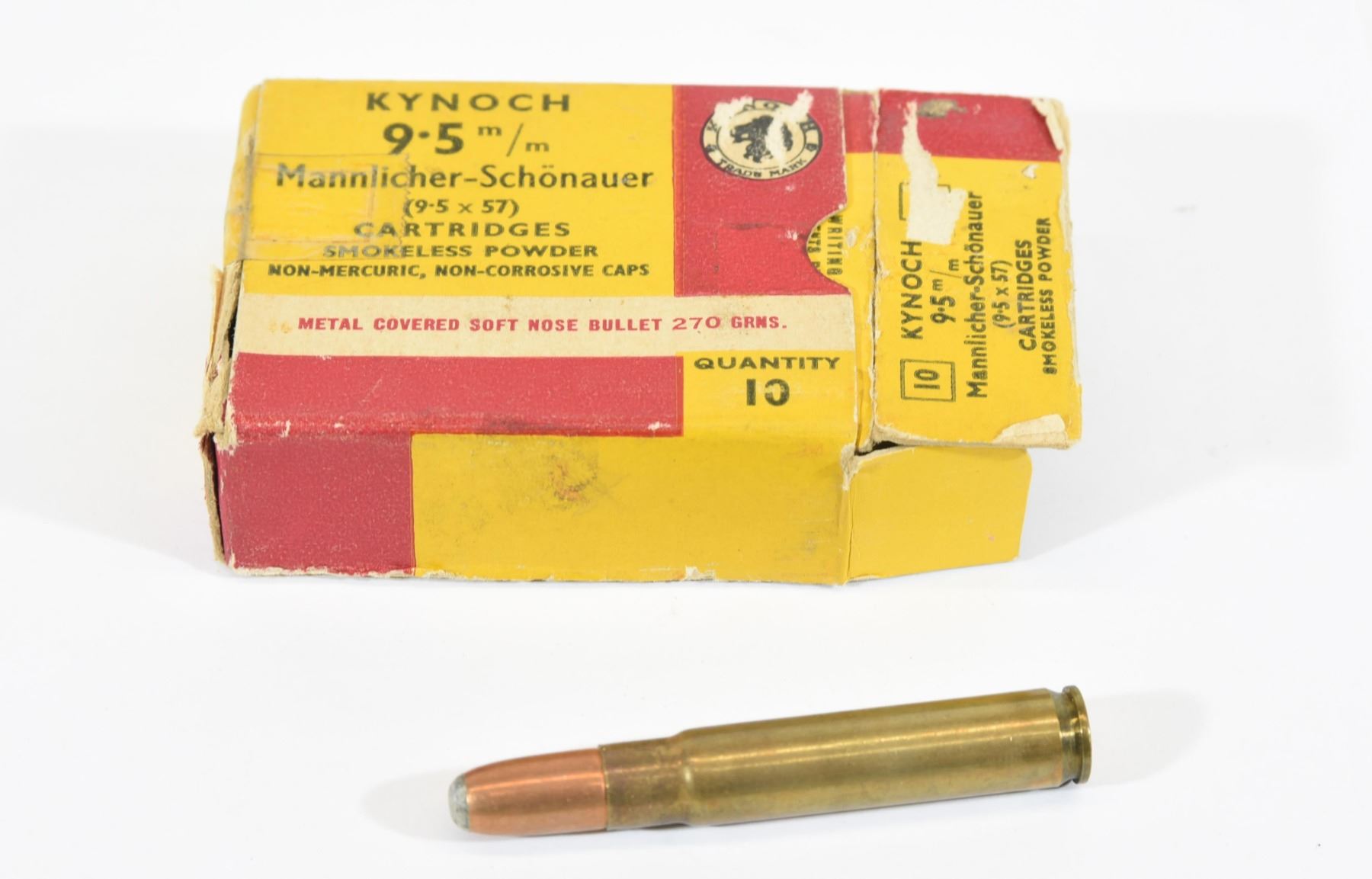 10-round box of Kynoch 9.5mm Mannlicher Schoenauer 270gr JSP.