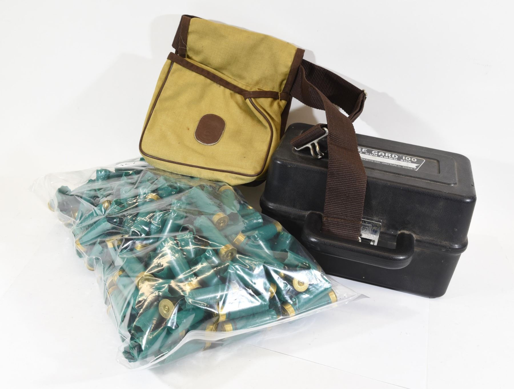One Bob Allen shooting bag. One MTM Case-Gard 100 with two 12ga shell trays. Approximately 200 once-fired 12ga hulls.