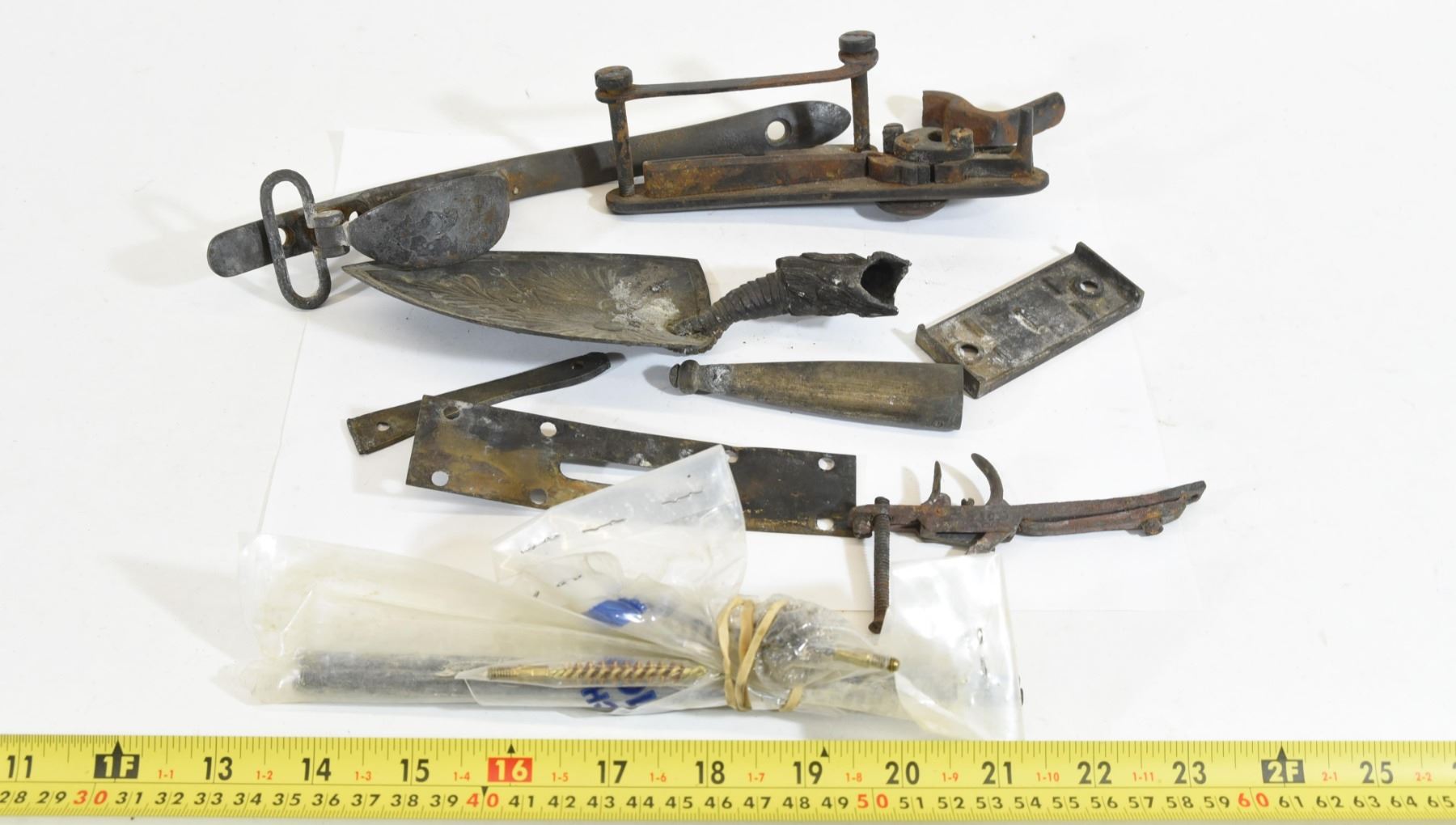 Various unknown gun parts including trigger assemblies, one hammer assembly and some cleaning brushes, and more.