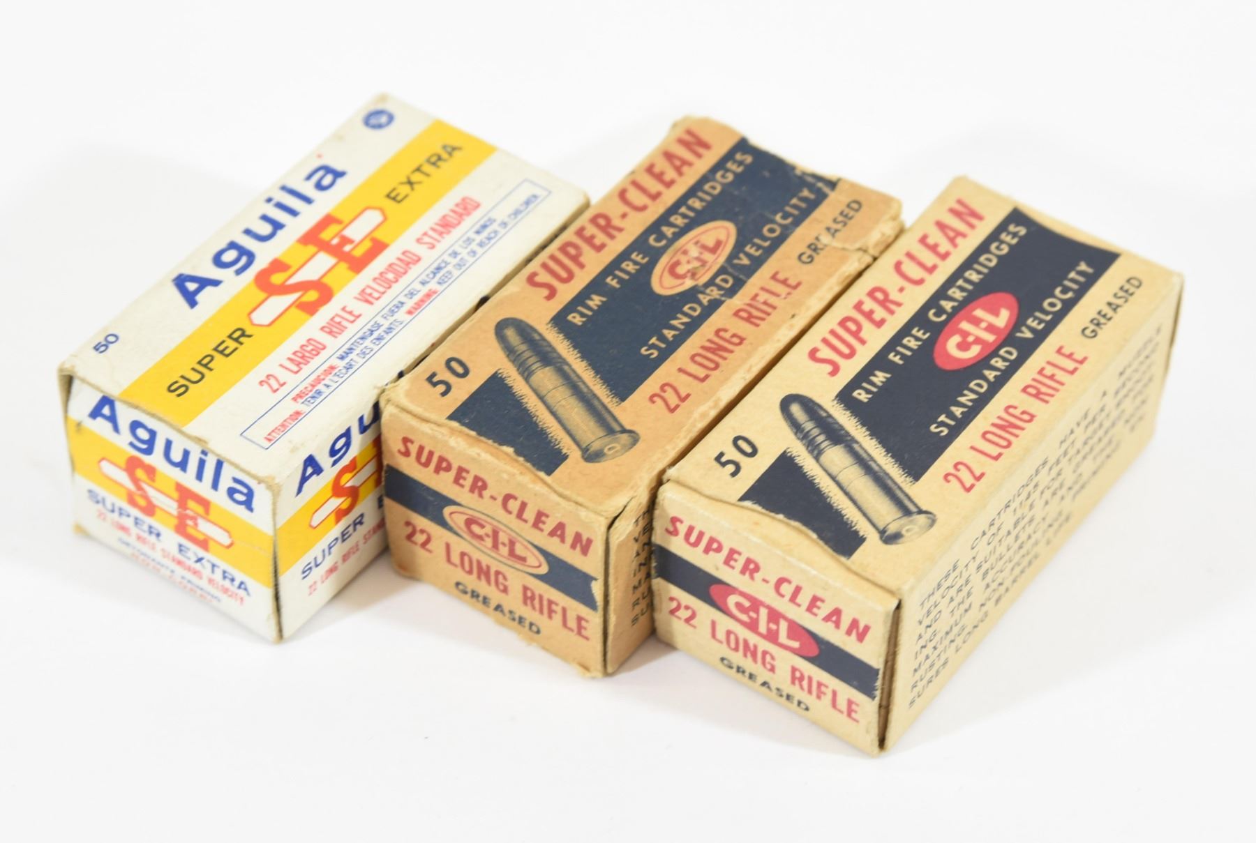 1) 79 rounds of vintage C-I-L Super Clean long rifle. One box is in good condition. 2) 22 rounds Aguila long rifle.